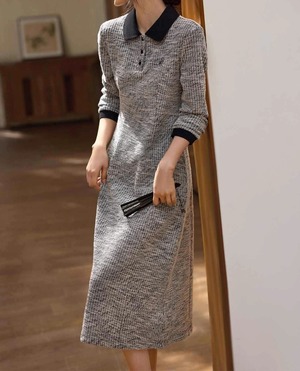 着用するだけでフェミニンな雰囲気が漂うポロカラーエレガントツイードデザインロングスリムドレス。