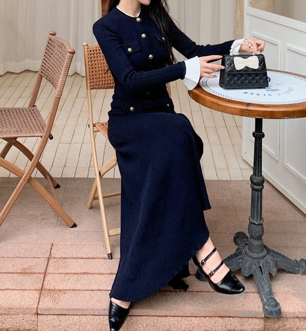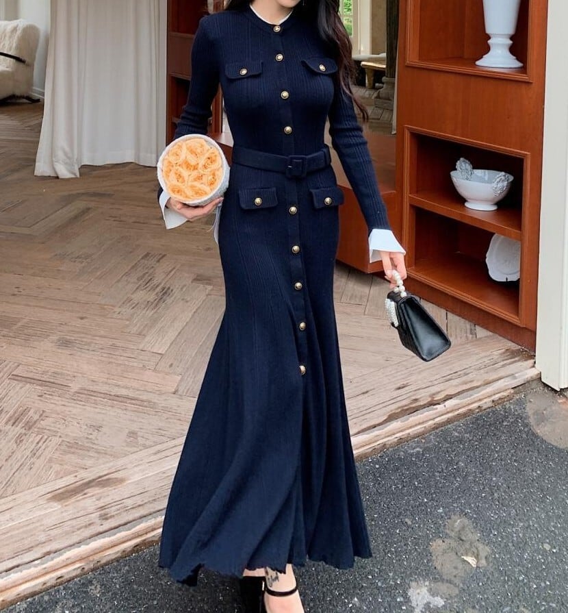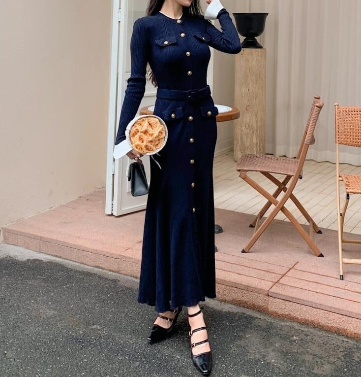 着用するだけでエレガントでフェミニンな雰囲気が漂うシングルブレストエレガントラージスイングロングニットドレス。