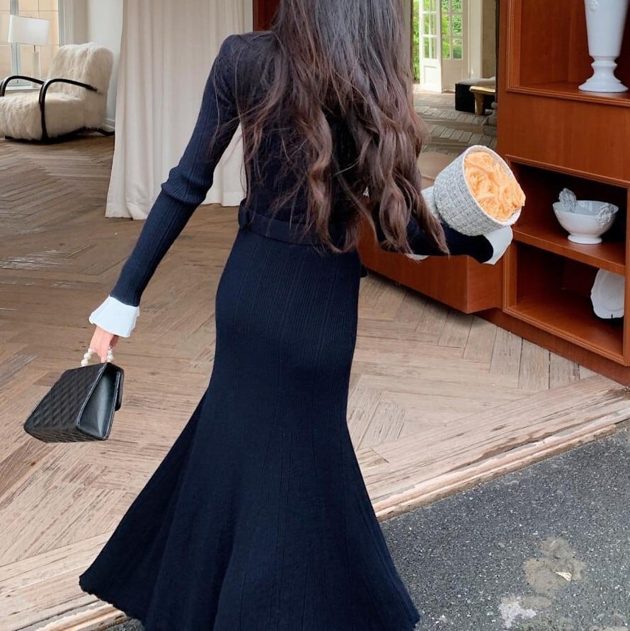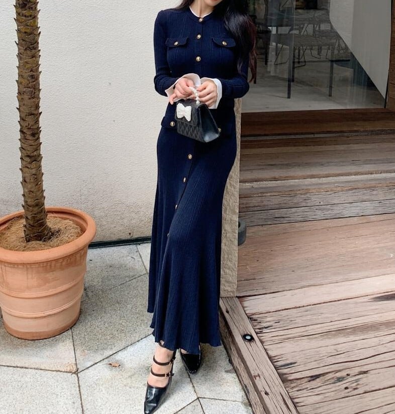 Single breast elegant large swing long knit dress