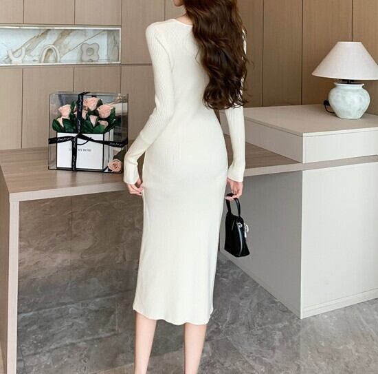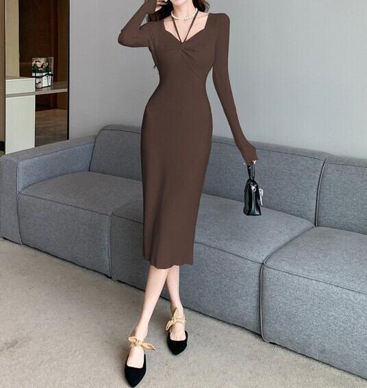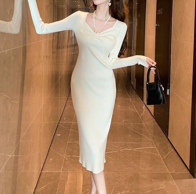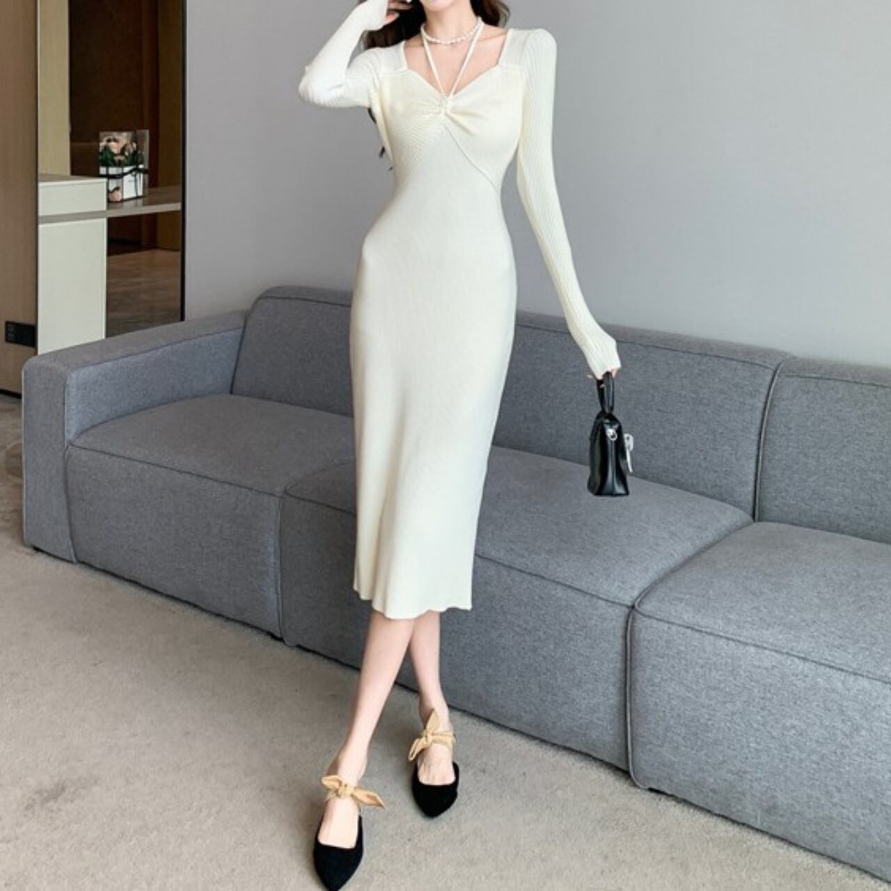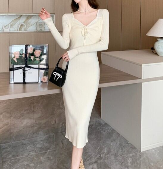 着用するだけでフェミニンな雰囲気が漂うスクエアカラーエレガントチェストリボンスリムニットドレス。