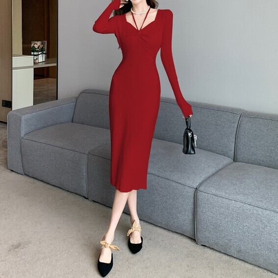 Square collar elegant chest ribbon slim knit dress