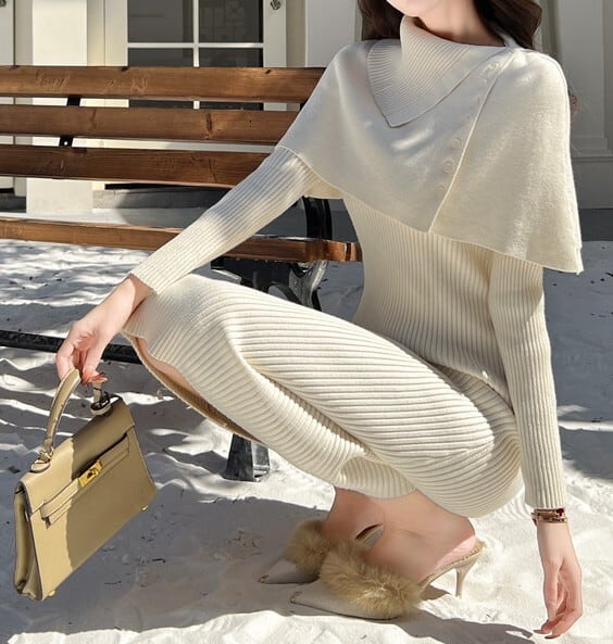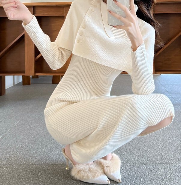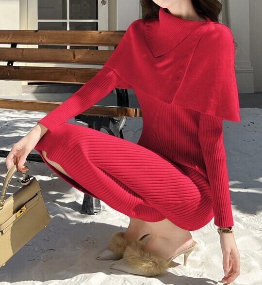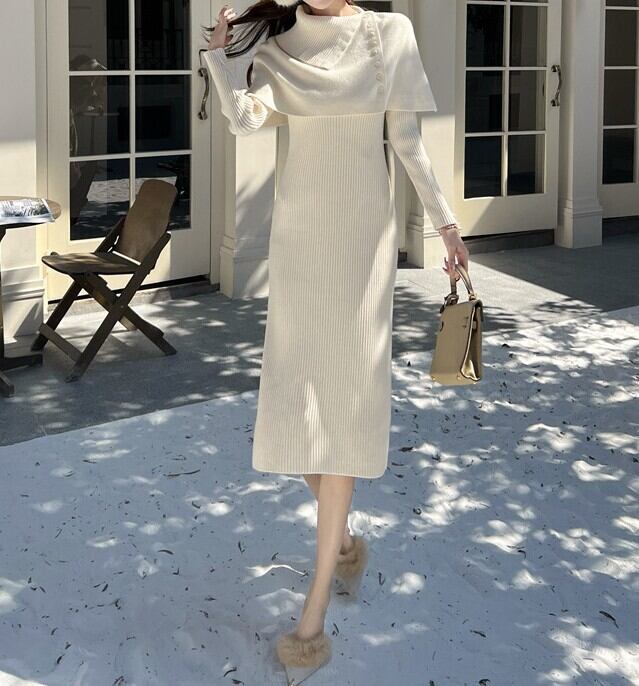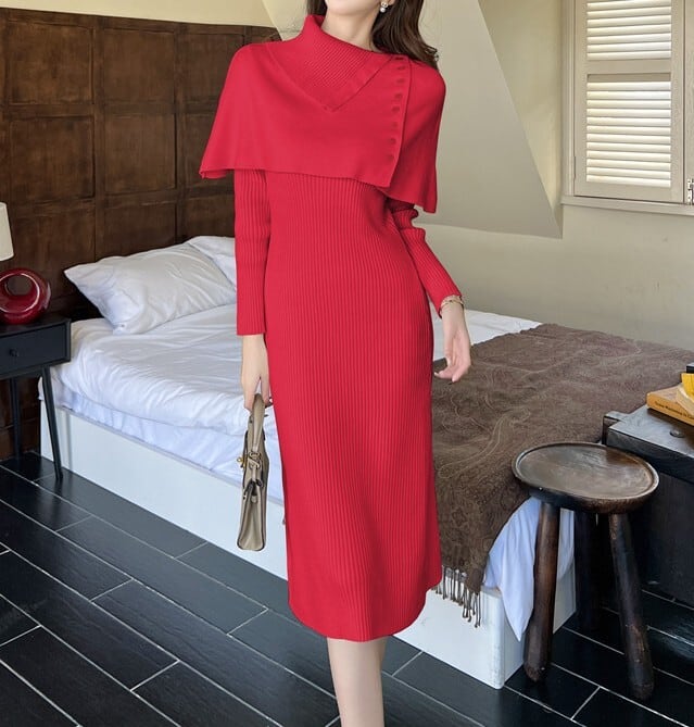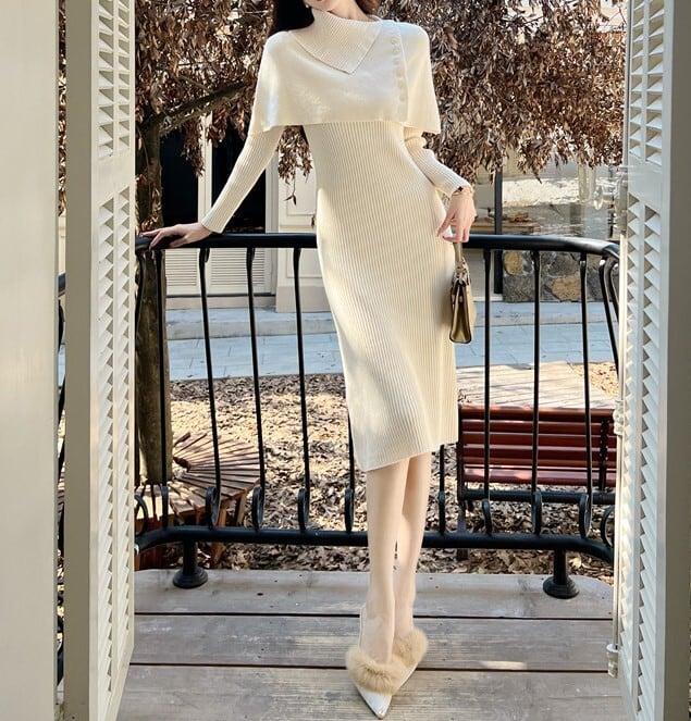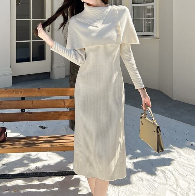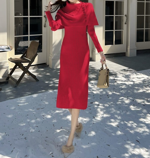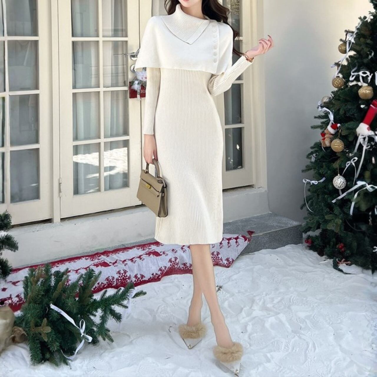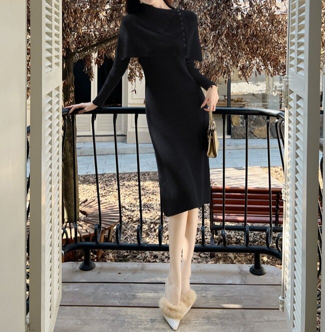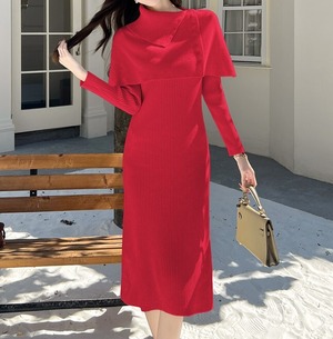 着用するだけでフェミニンな雰囲気が漂うショールカラーエレガントスリムニットドレス。