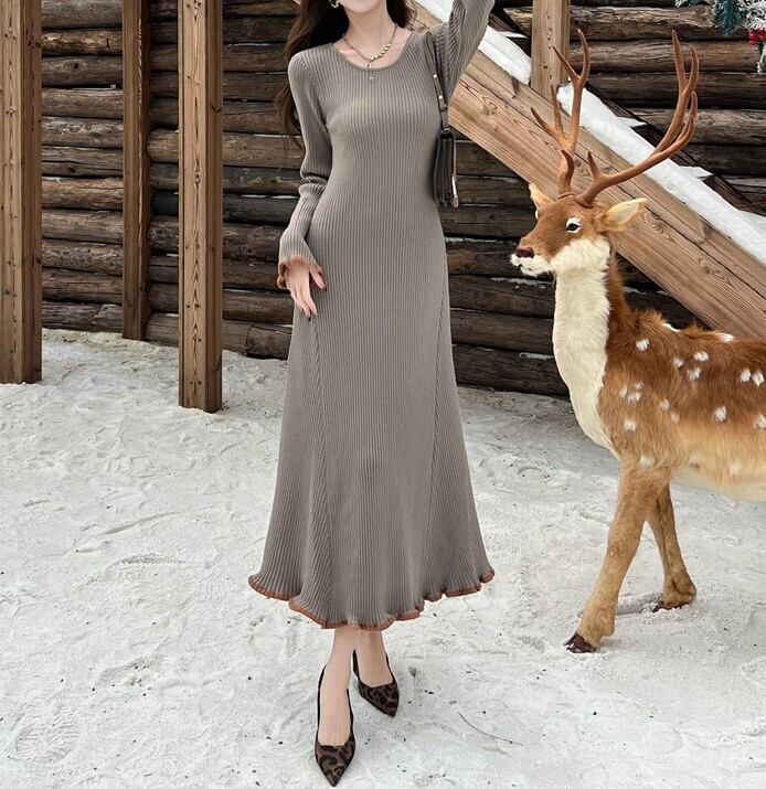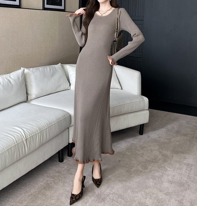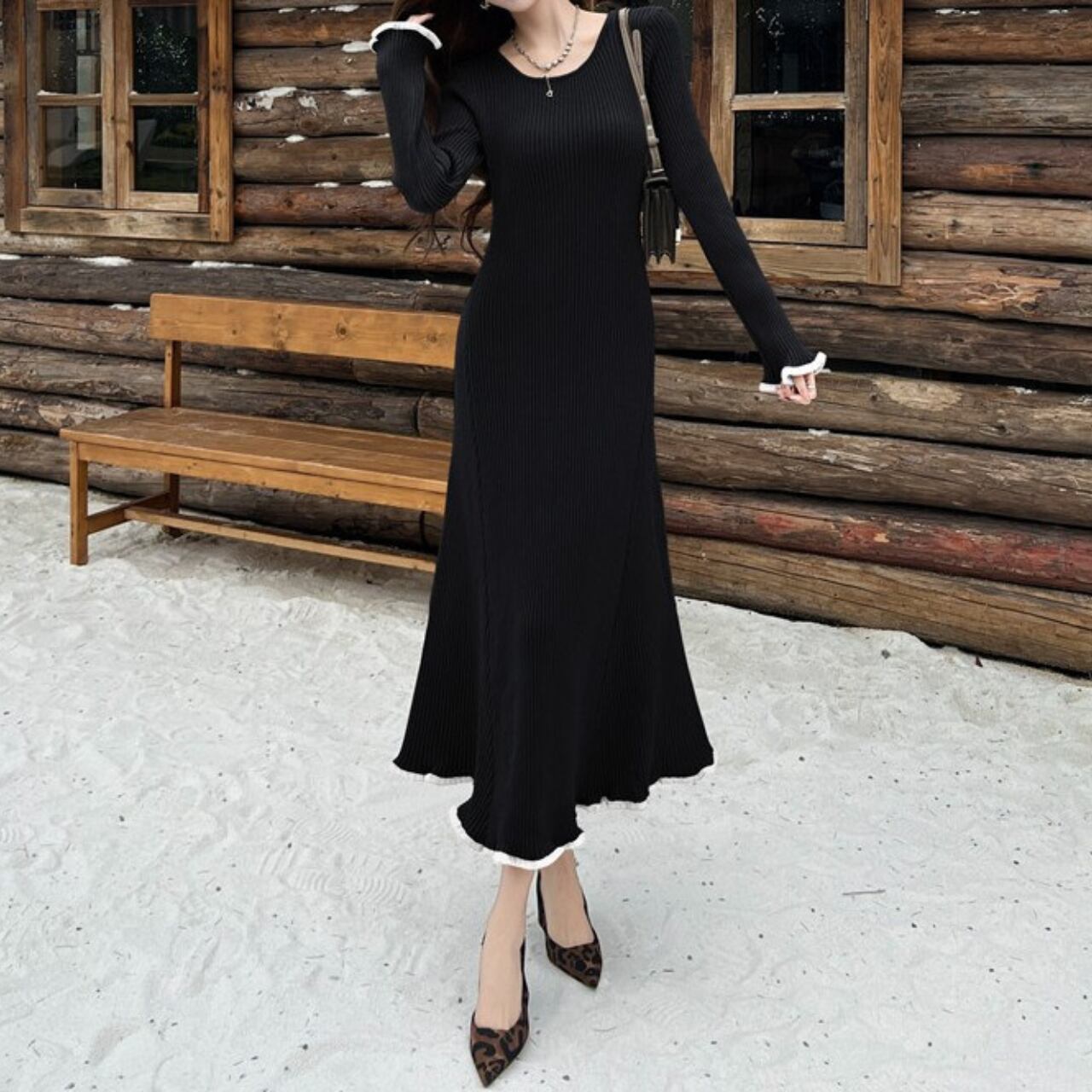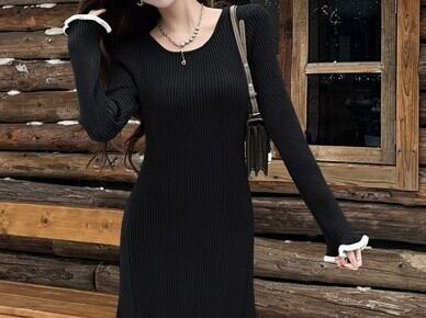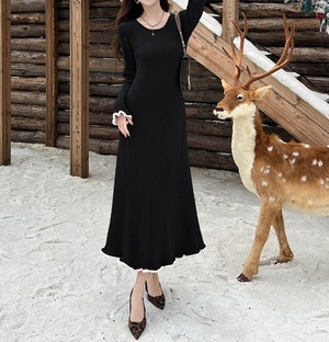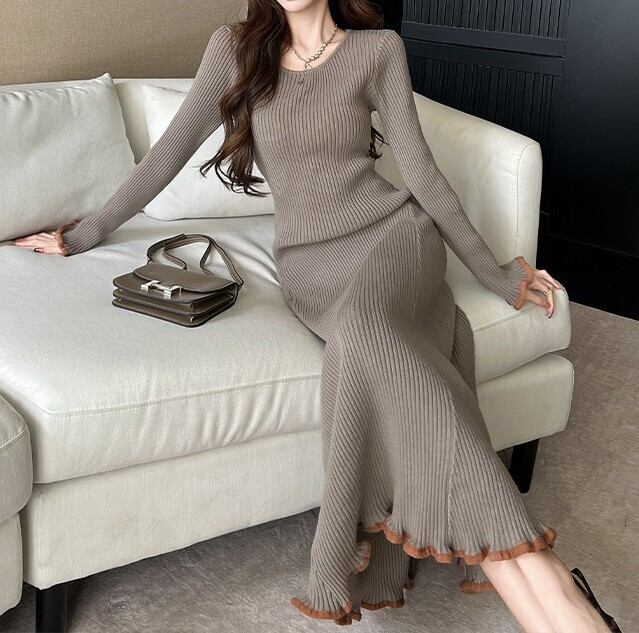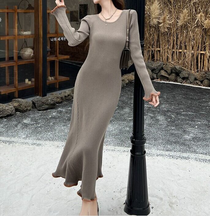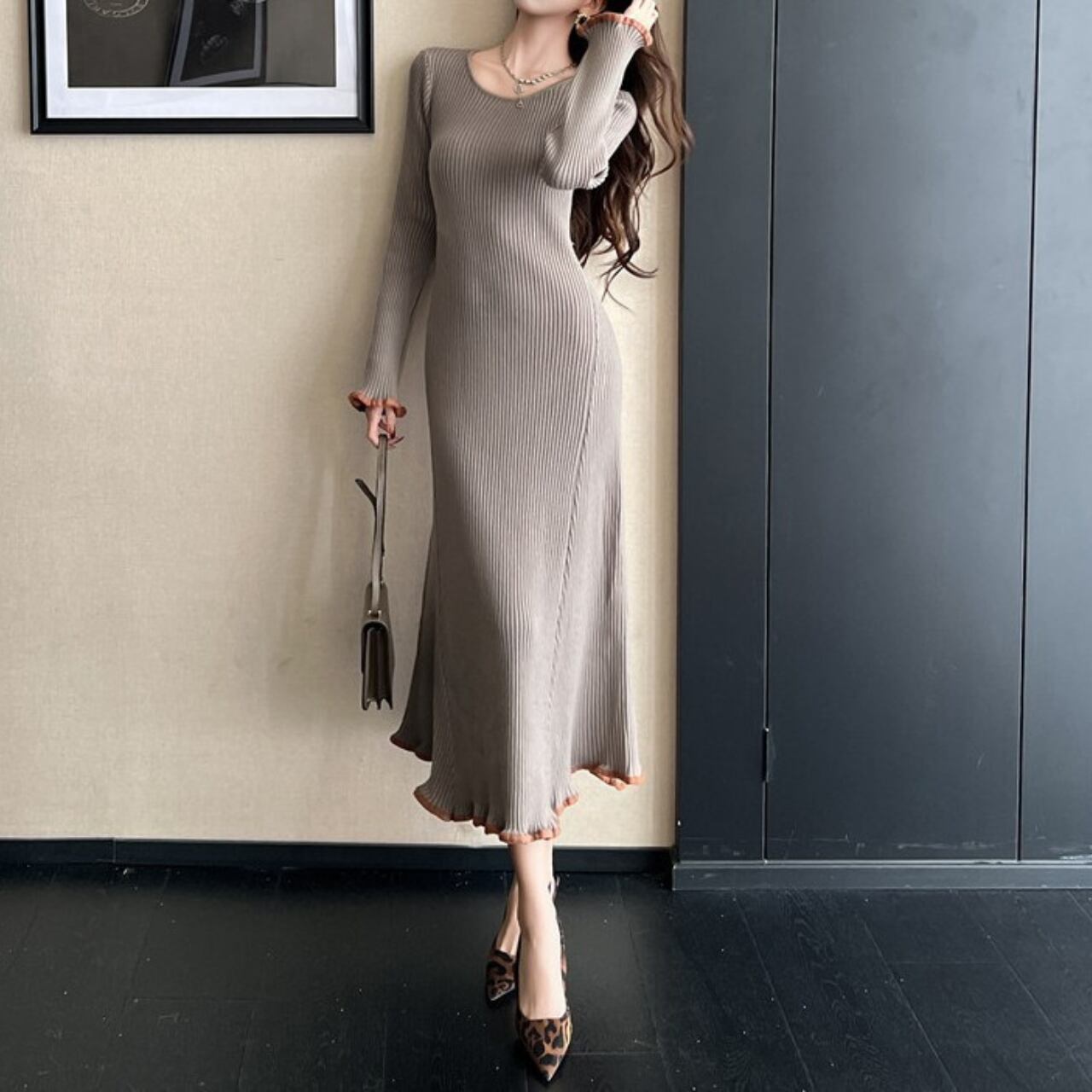 着用するだけでフェミニンな雰囲気が漂うフレアスリーブエレガントスリムフィットスイングニットドレス。