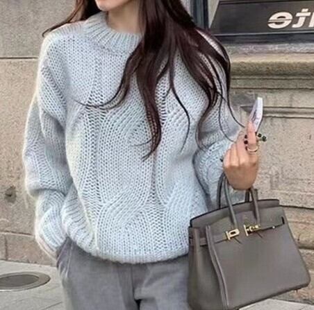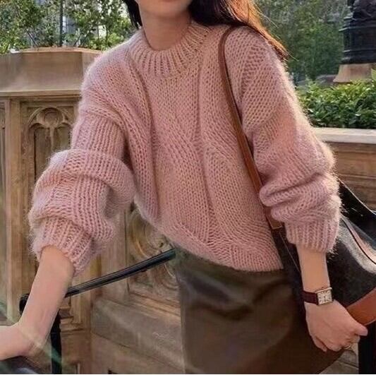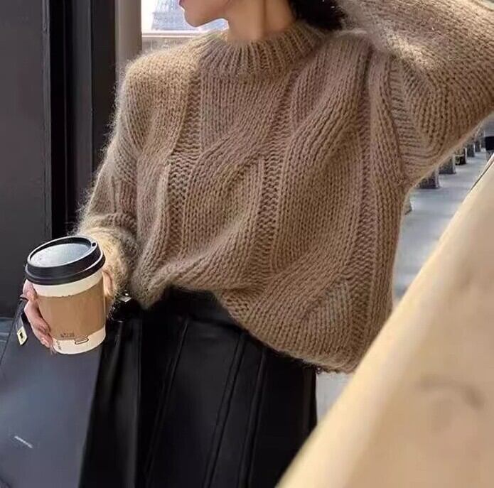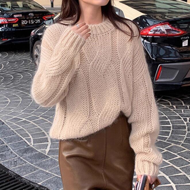 Round neck elegant fluffy velvet cable knit