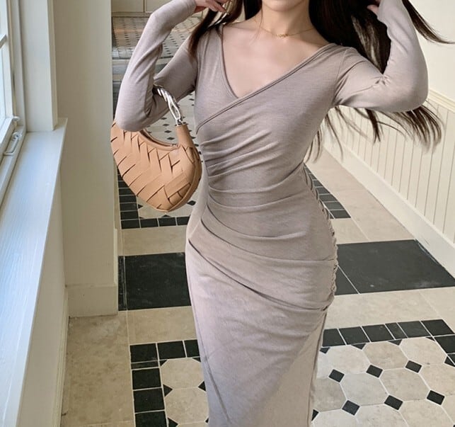 着用するだけでフェミニンな雰囲気が漂うクロスVネックエレガントウエストプリーツロングニットドレス。