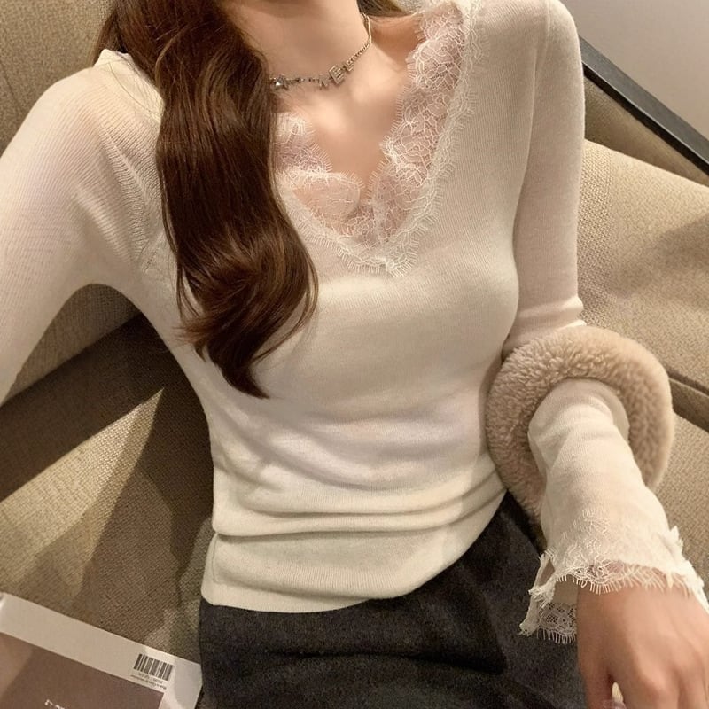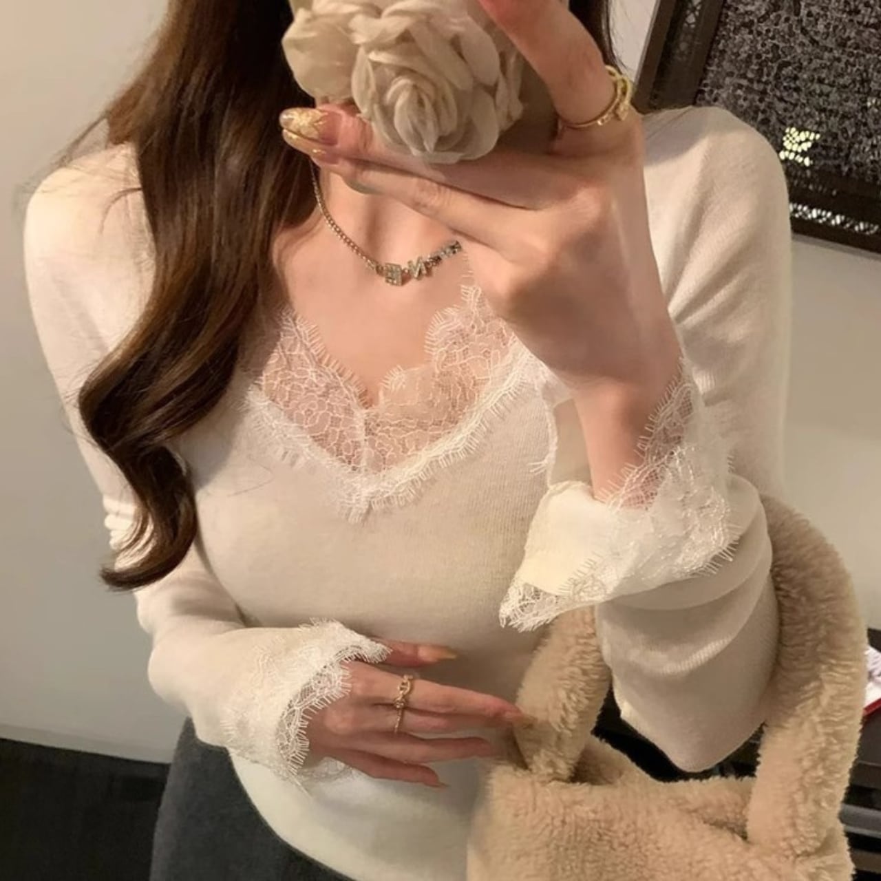 着用するだけでフェミニンな雰囲気が漂うVネックエレガントレースステッチフラッフィーニット。