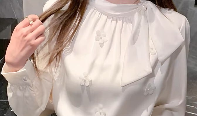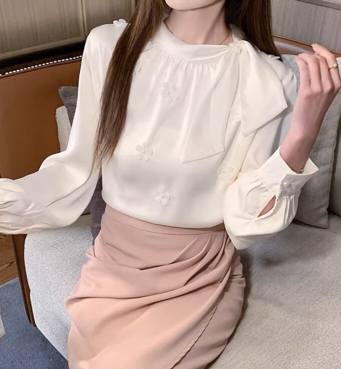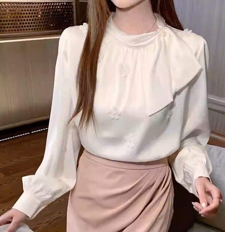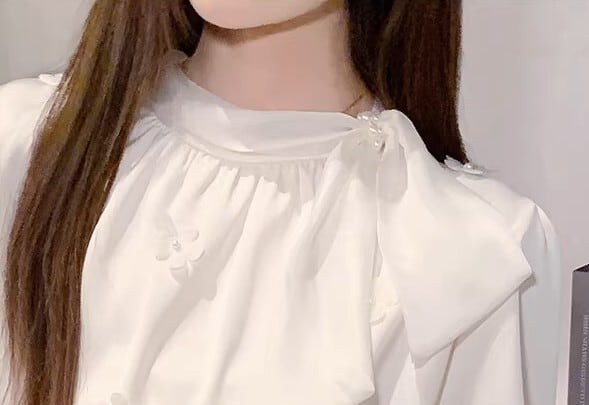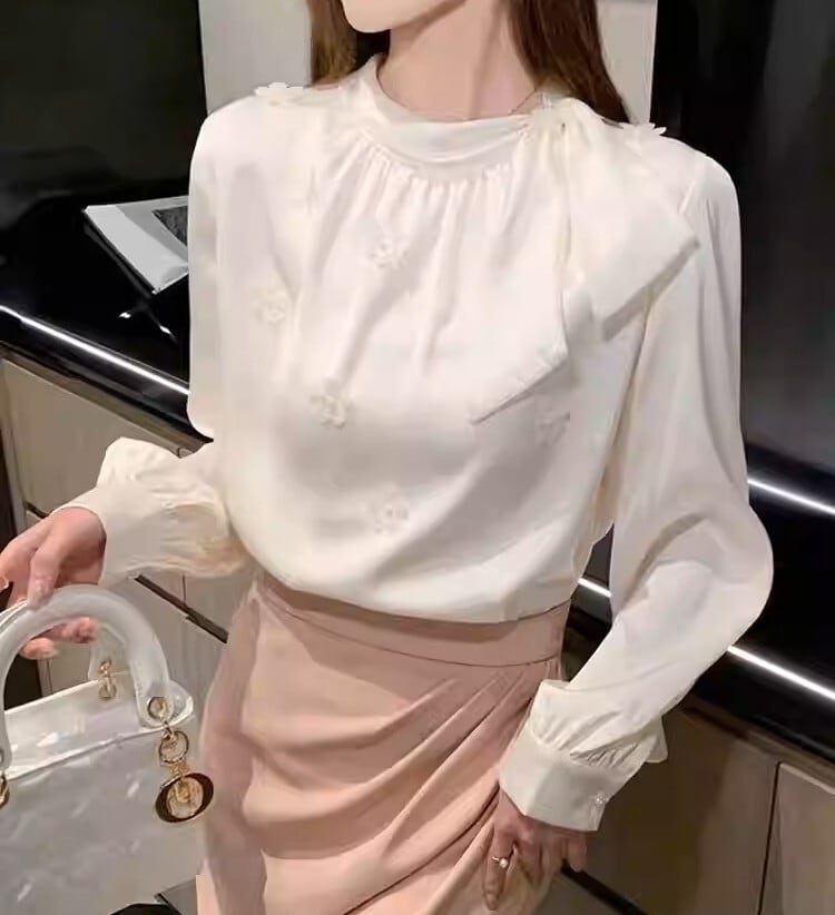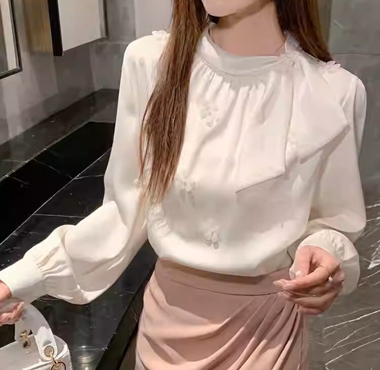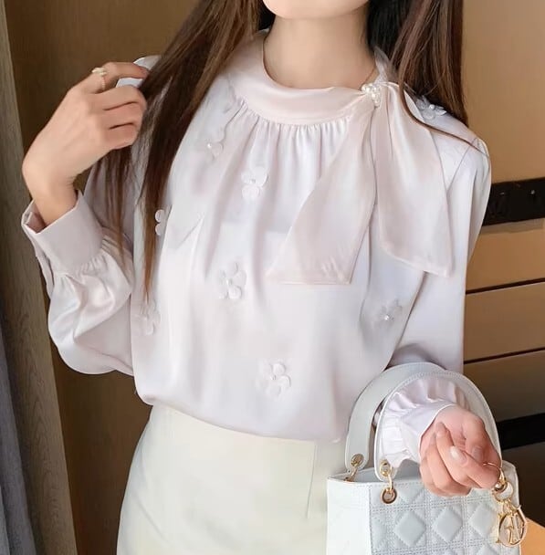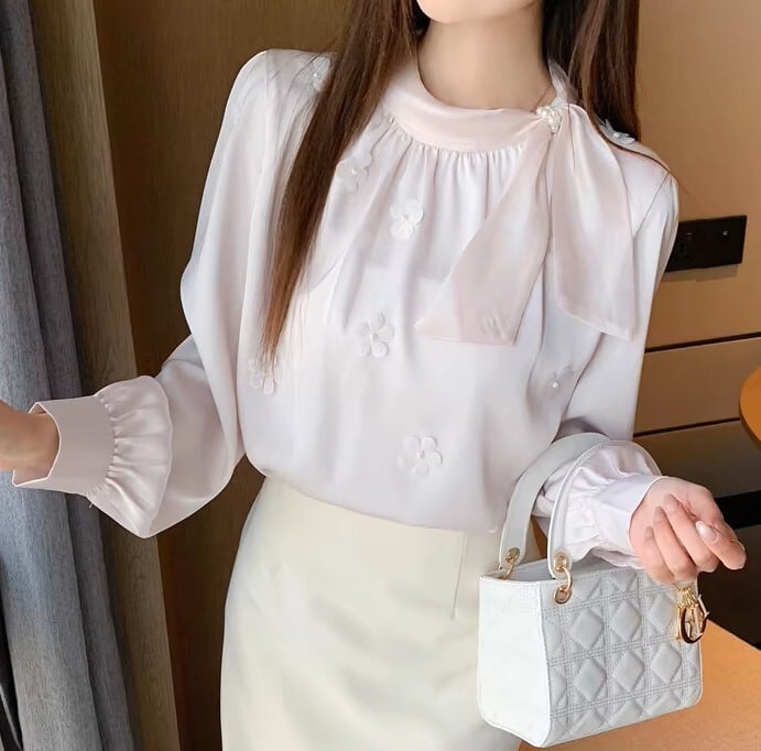 Chest tie elegant floral stitch chiffon shirt ( 2color )