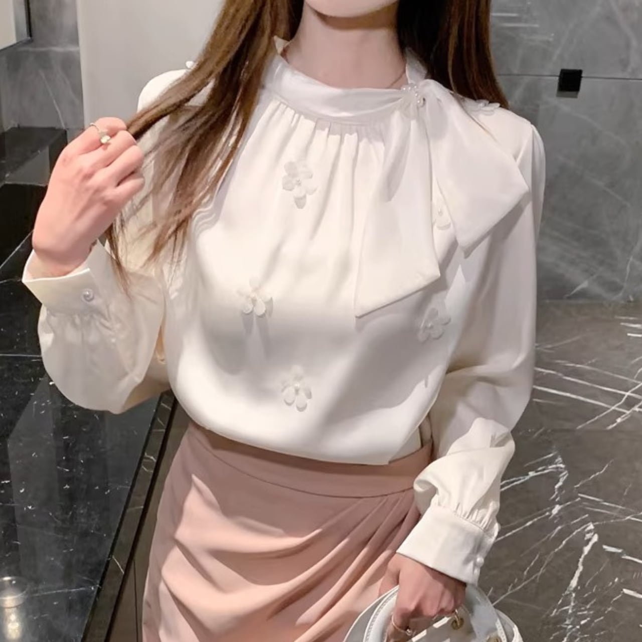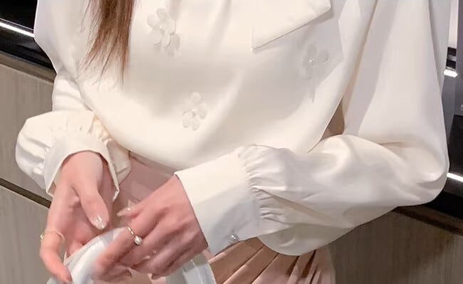 着用するだけでフェミニンな雰囲気が漂うチェストタイエレガントフローラルステッチシフォンシャツ。