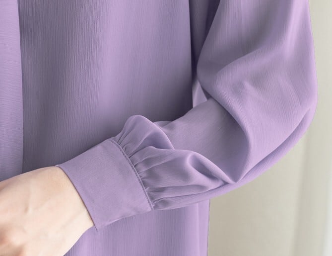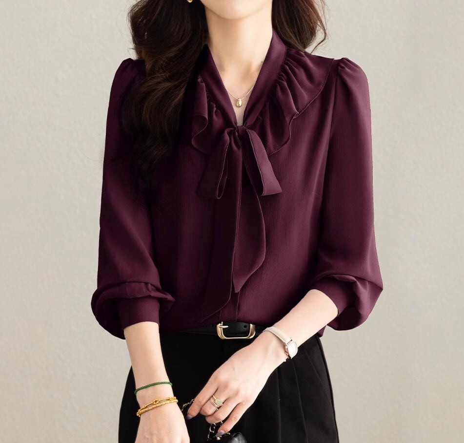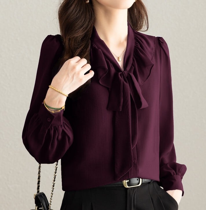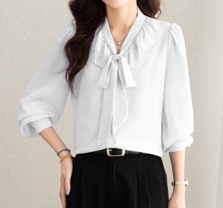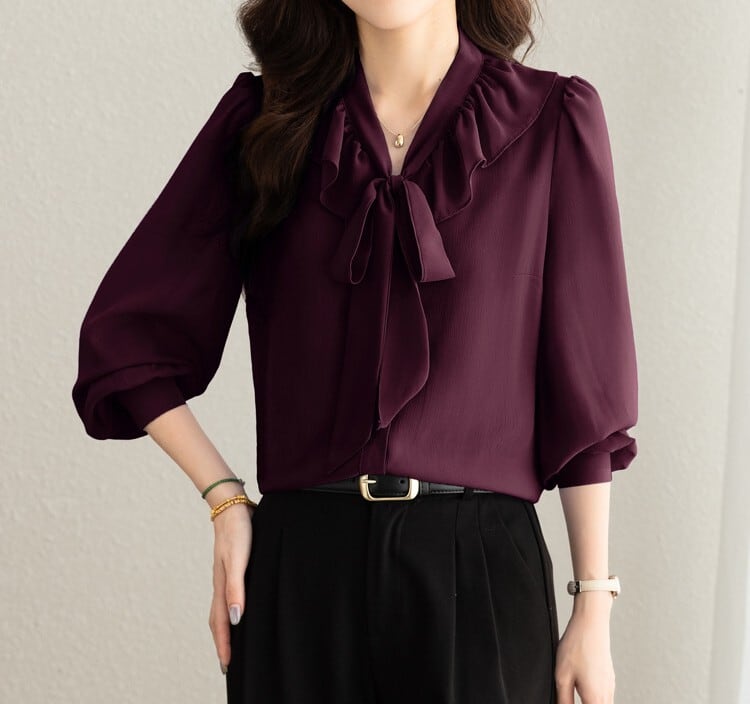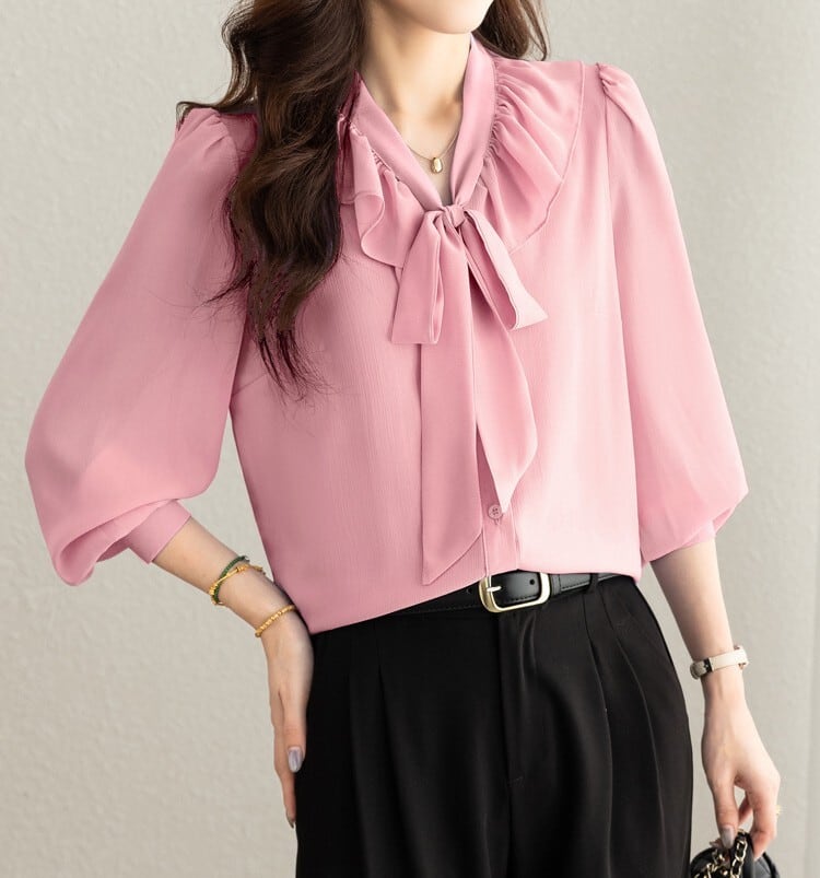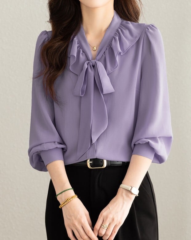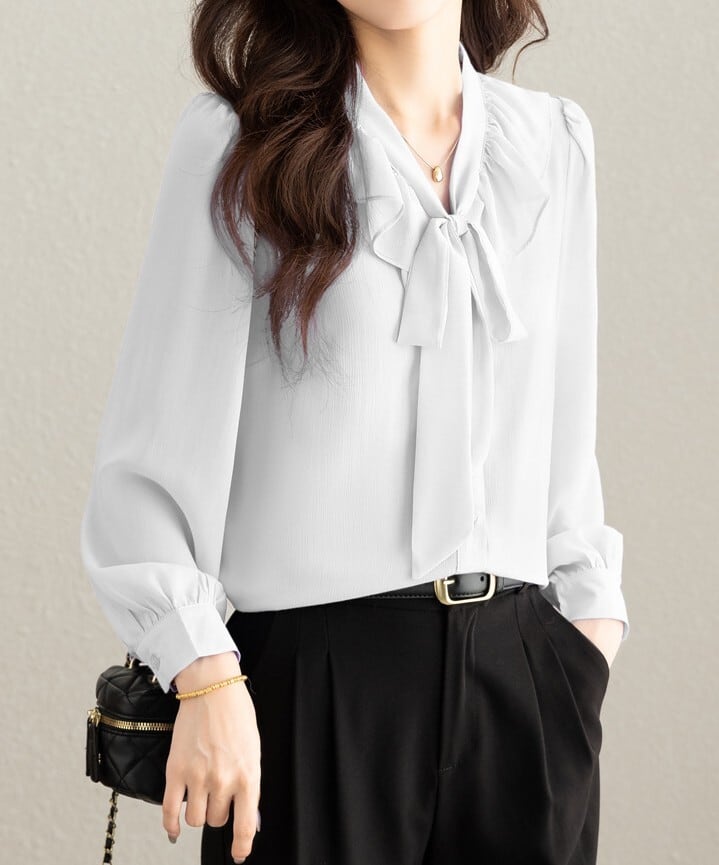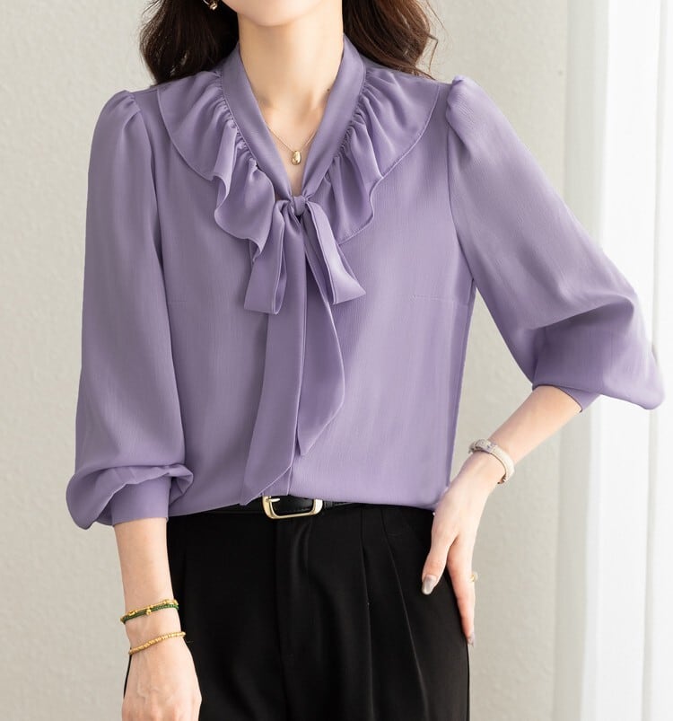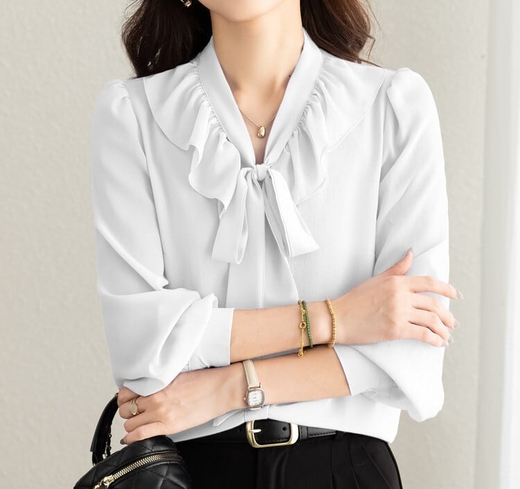 着用するだけで大人可愛い雰囲気が漂うチェストラッフルエレガントスリムシフォンブラウス。