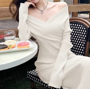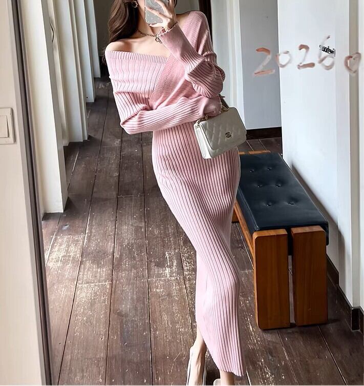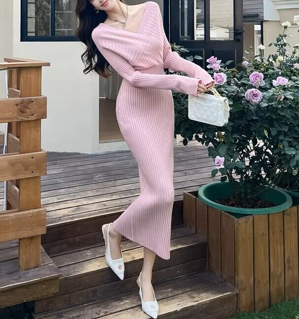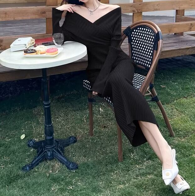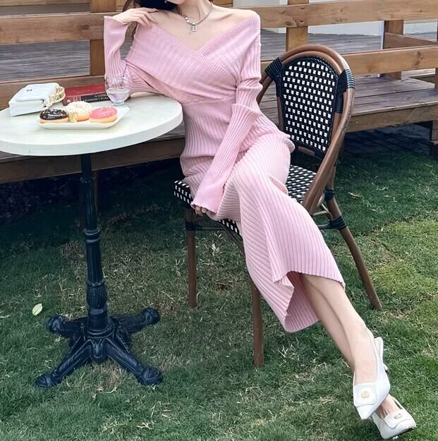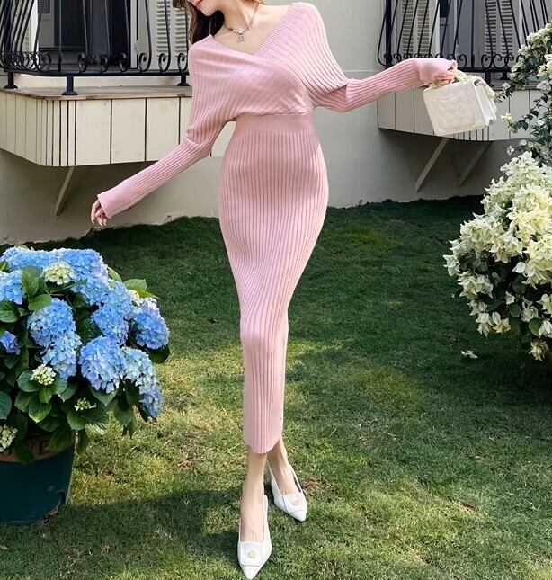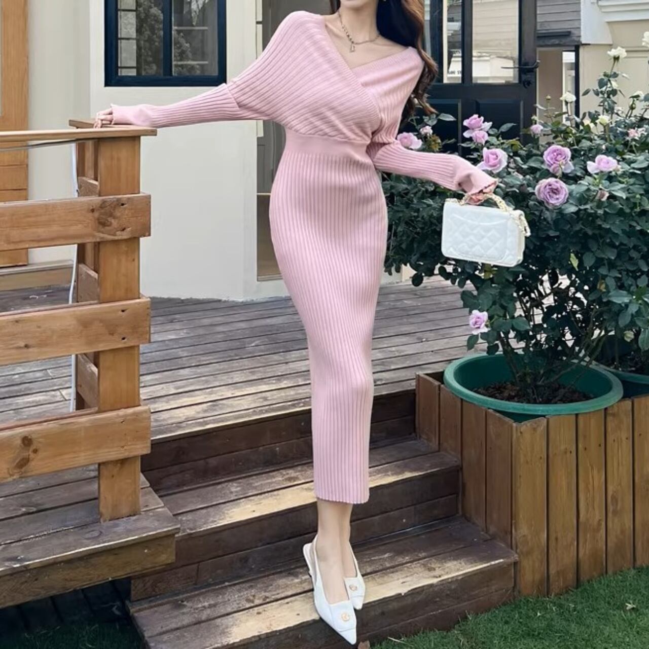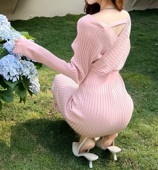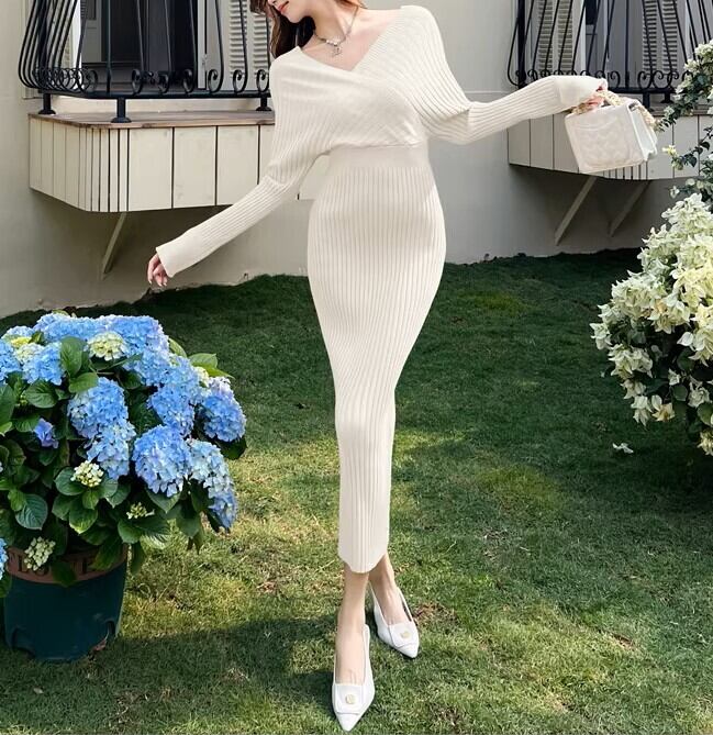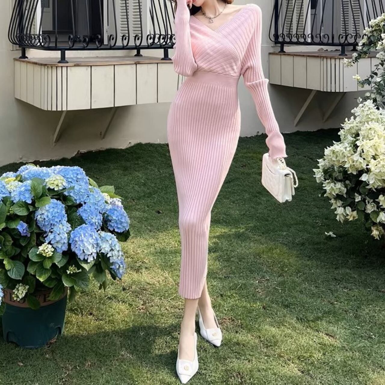 着用するだけでフェミニンな雰囲気が漂うVネックエレガントスリムフィットロングリブニットドレス。