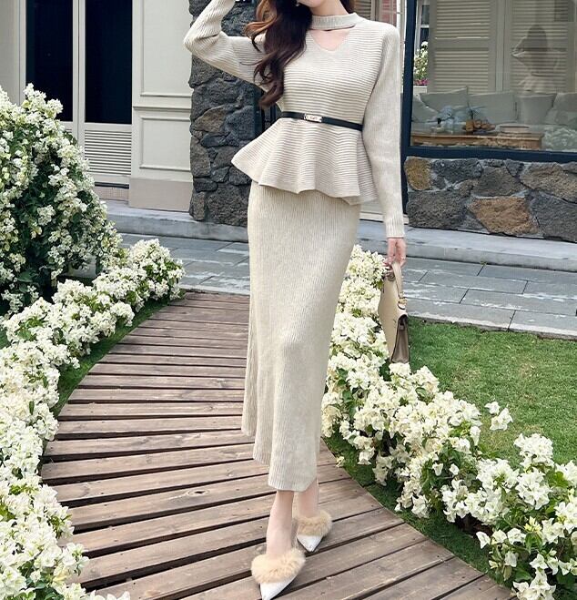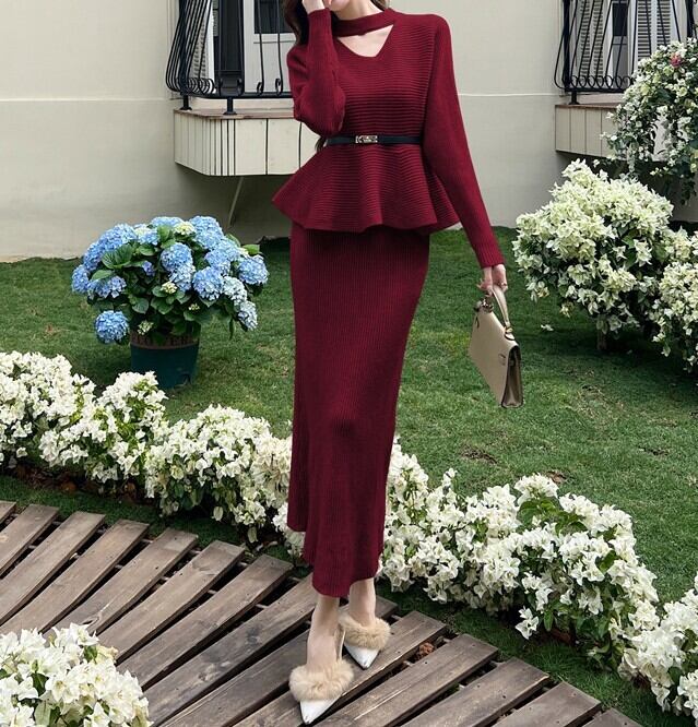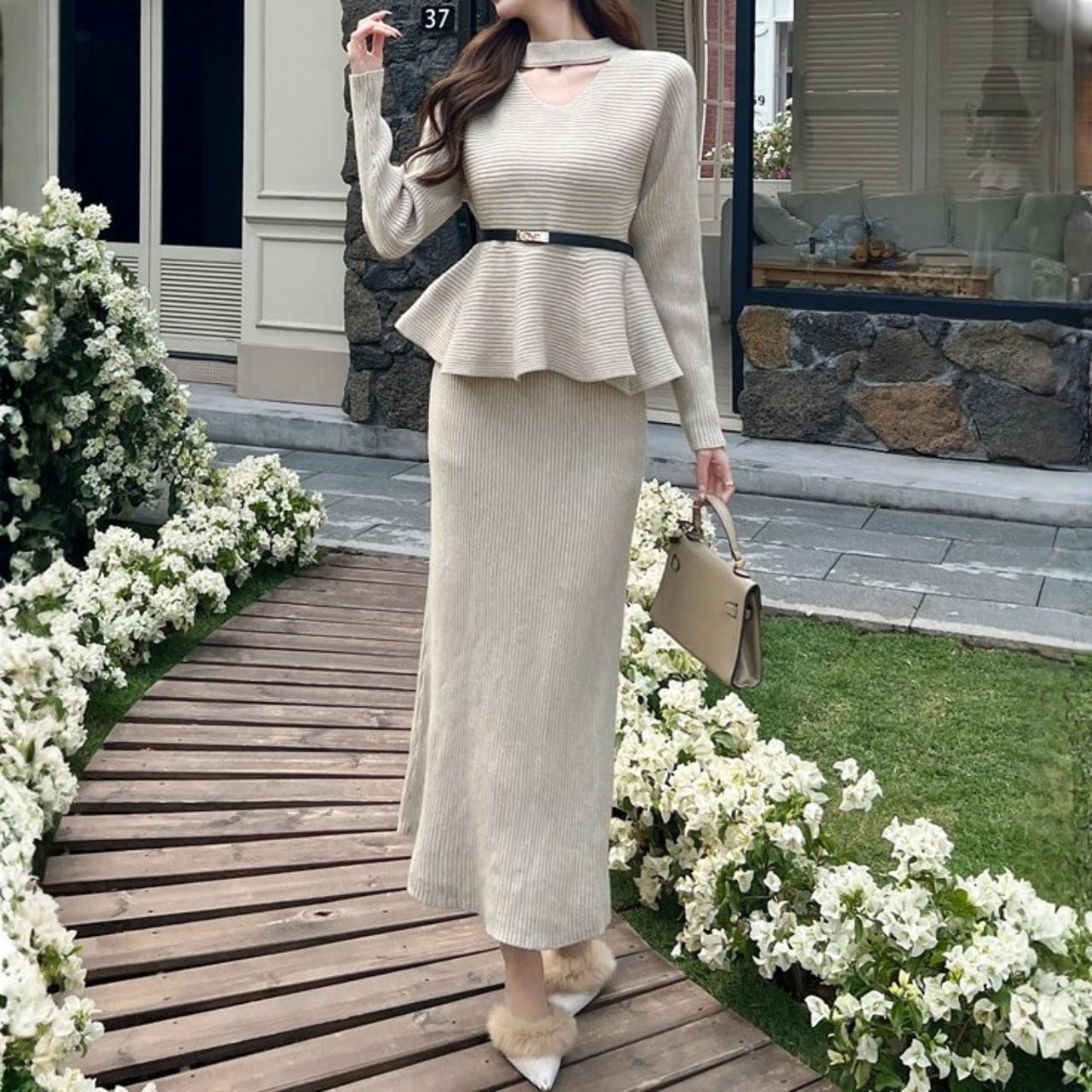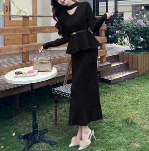 着用するだけでフェミニンな雰囲気が漂うホルターネックエレガントウエストラッフルロングニットドレスセットアップ。