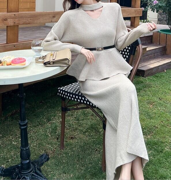 ホルターネックウエストラッフルニットとハイウエストロングニットスカートのセット商品です。