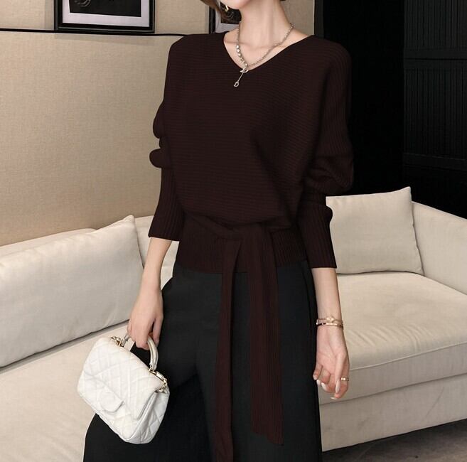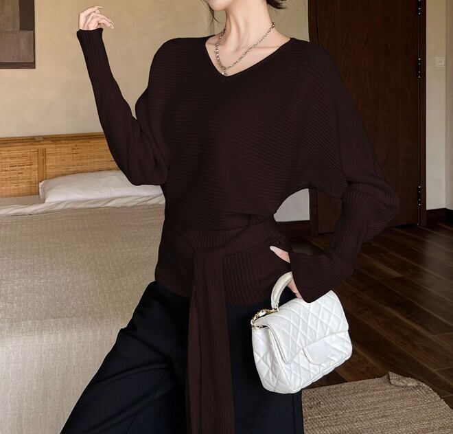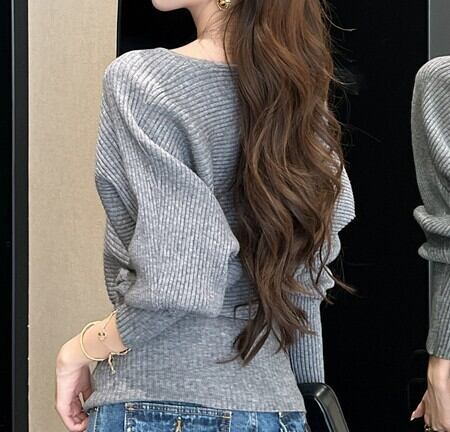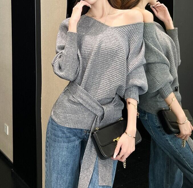 着用するだけでフェミニンな雰囲気が漂うVネックエレガントストラップスリムニット。