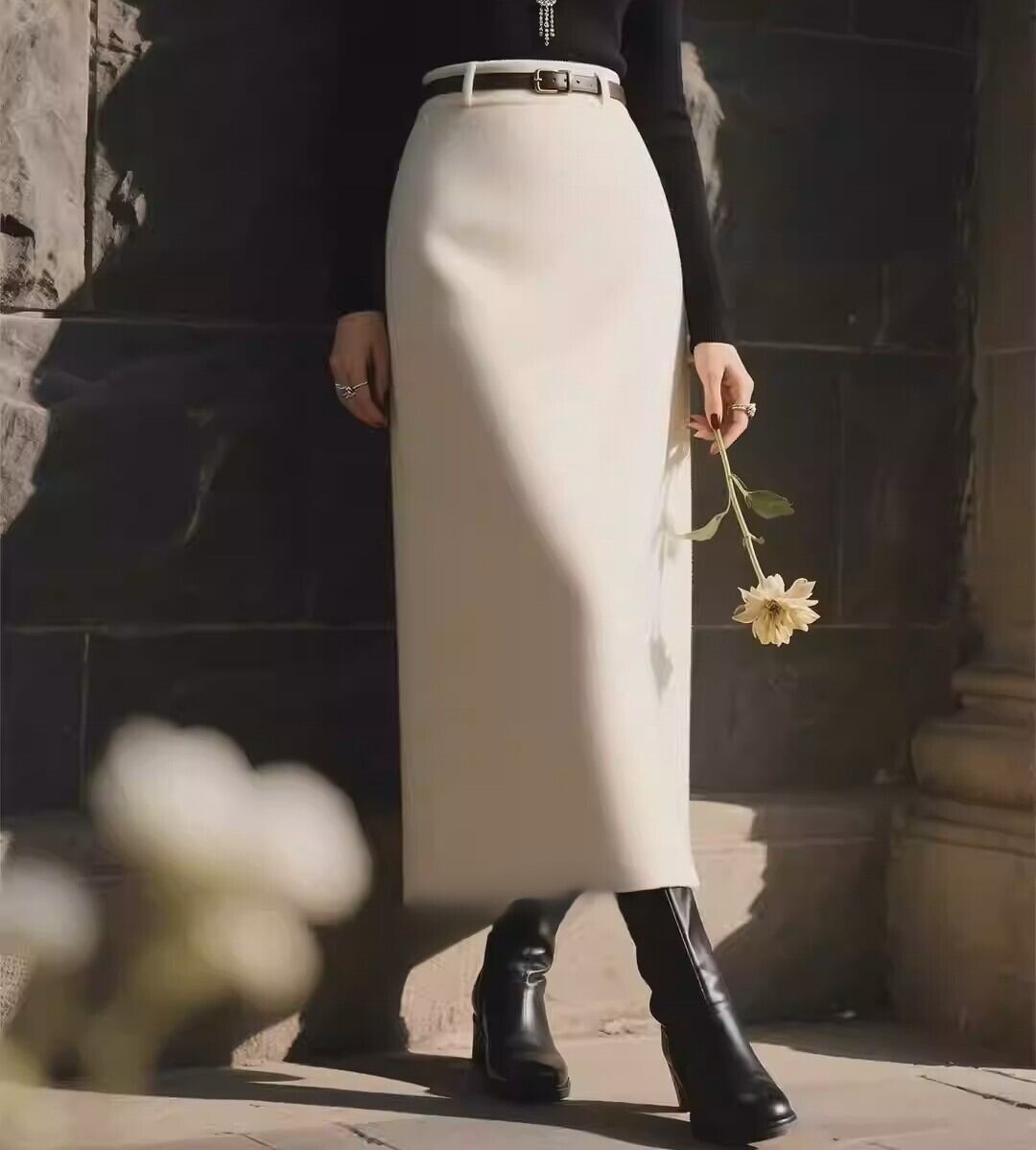 High waist elegant long slim wool skirt