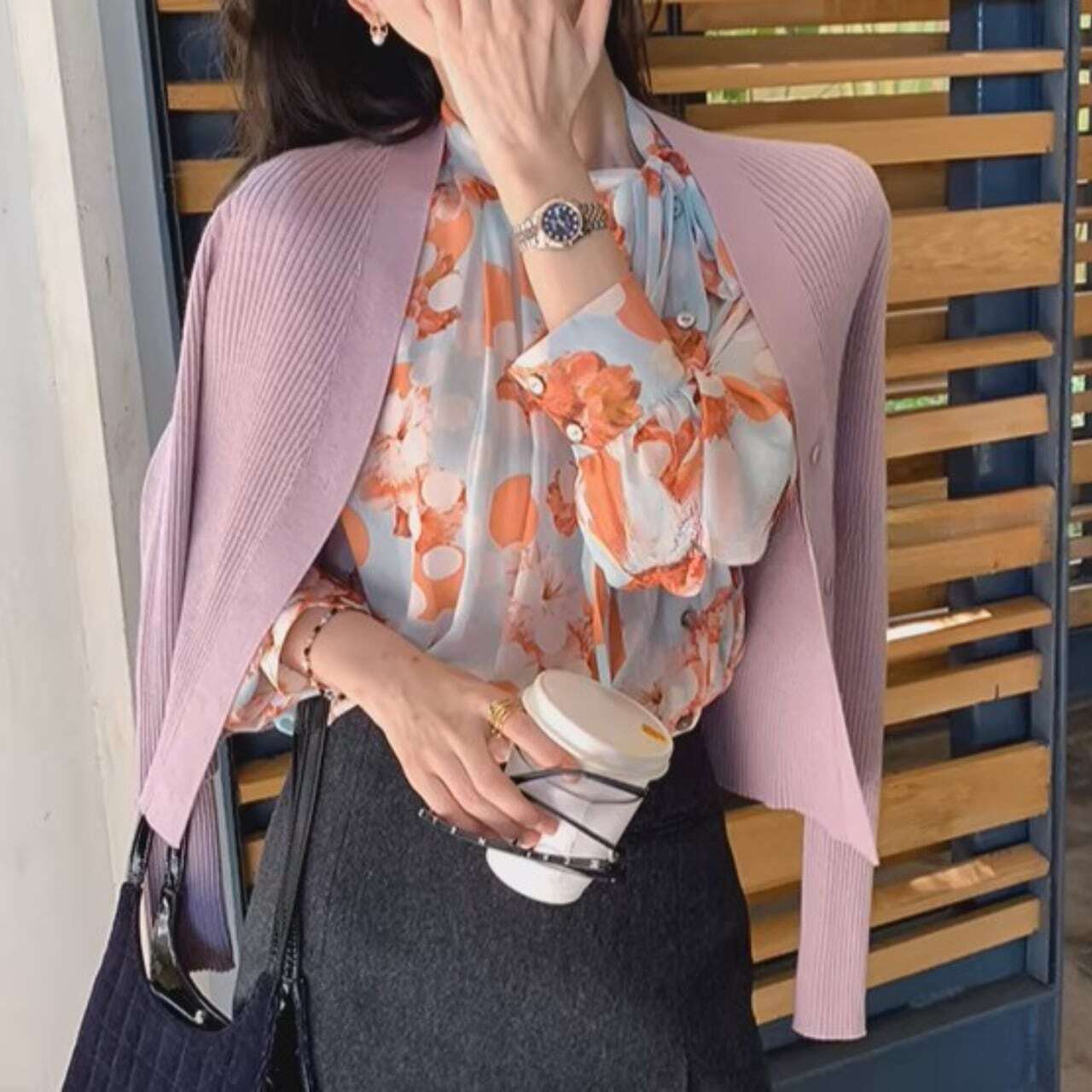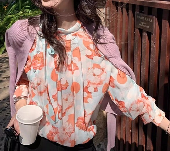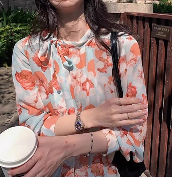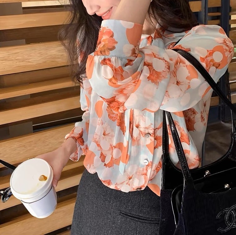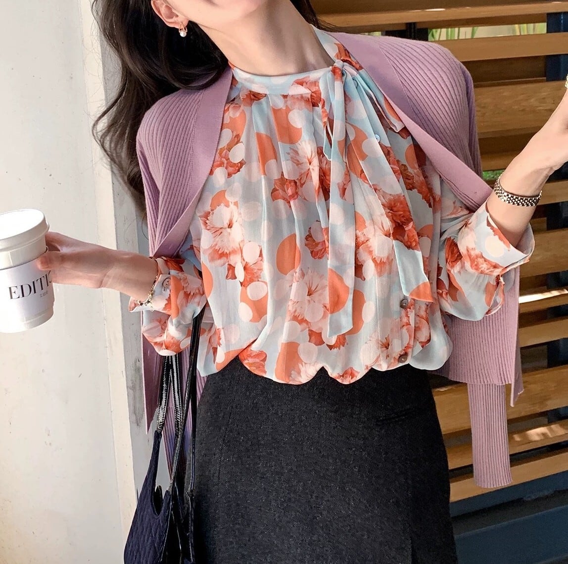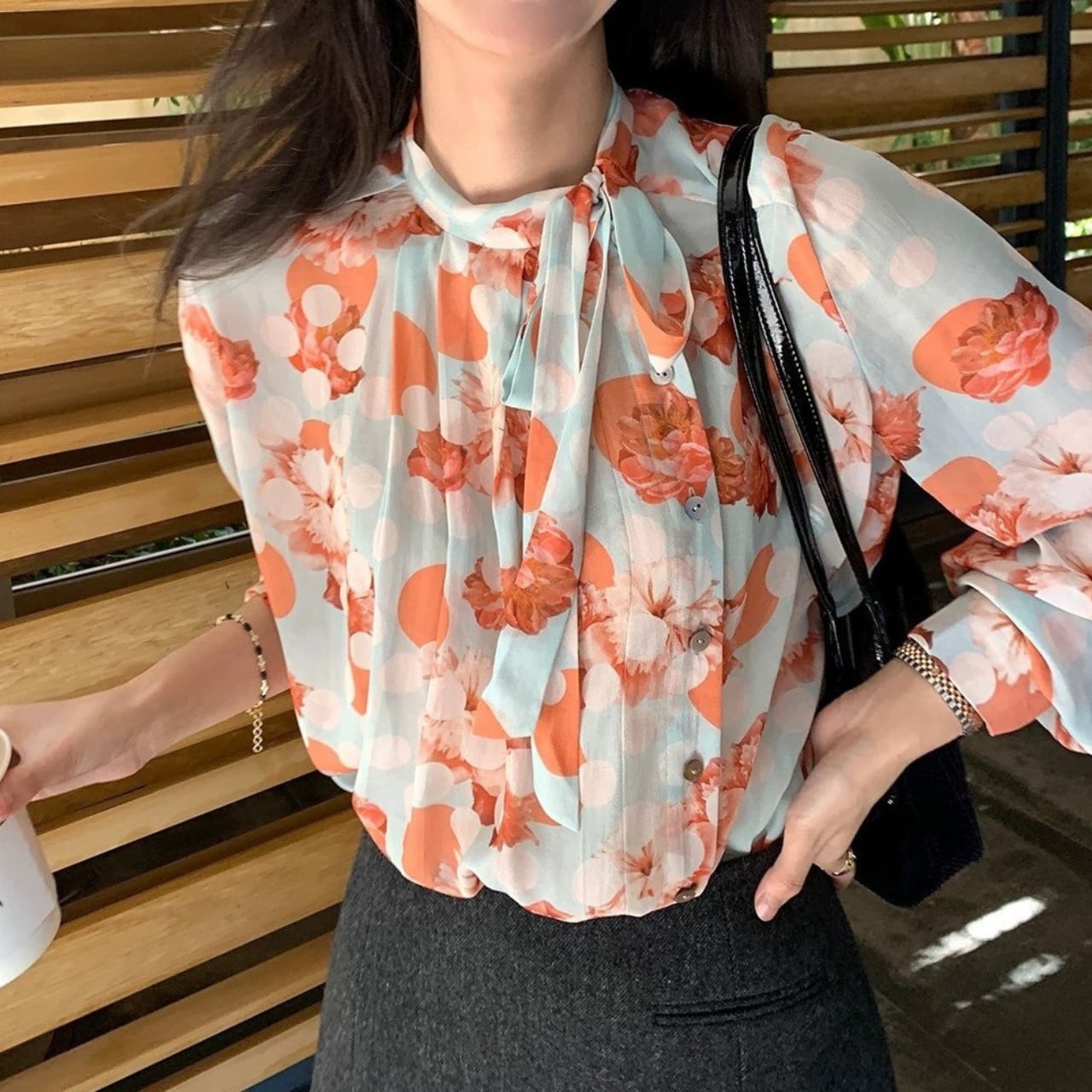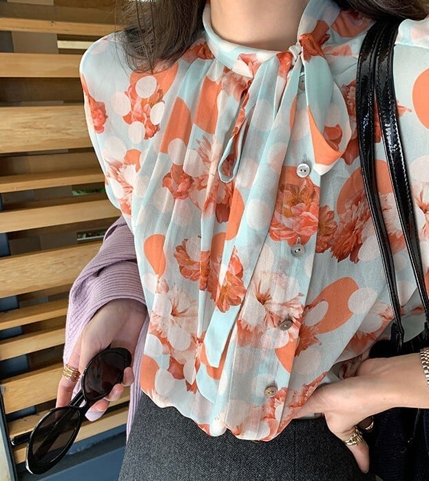 着用するだけでフェミニンな雰囲気が漂うチェストタイエレガントフローラルシフォンブラウス。