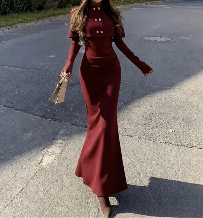 着用するだけでフェミニンな雰囲気が漂うダブルブレストエレガントスリムフィットショールニットドレス。
