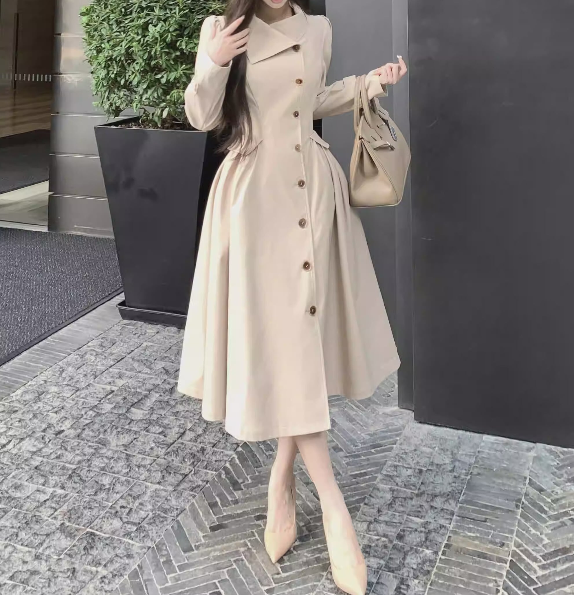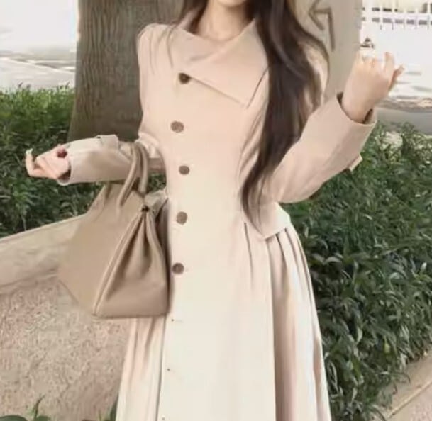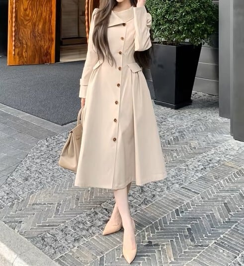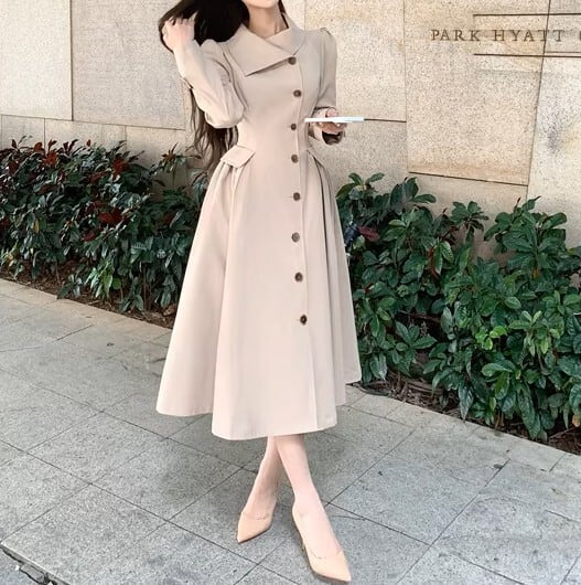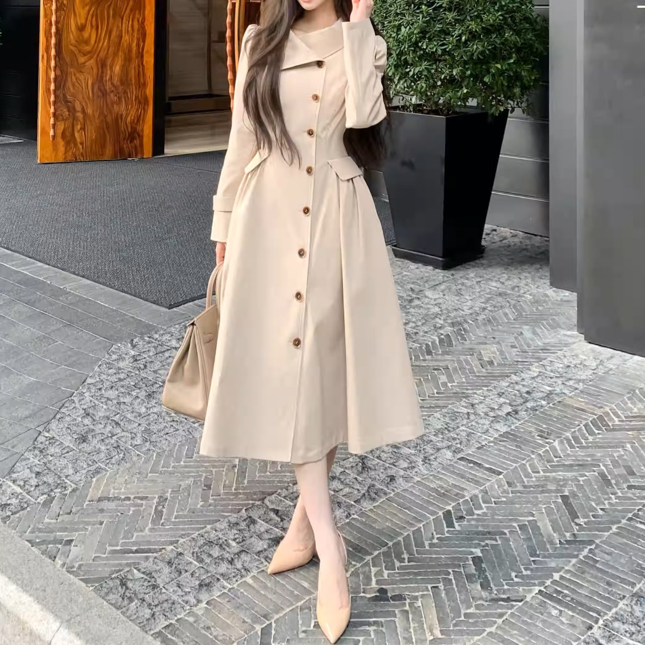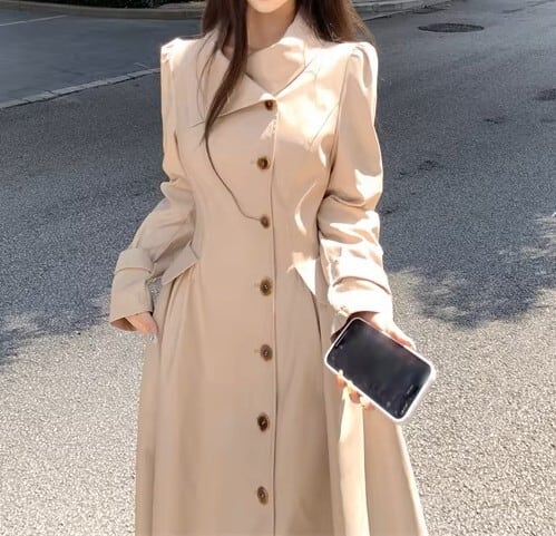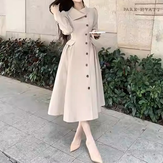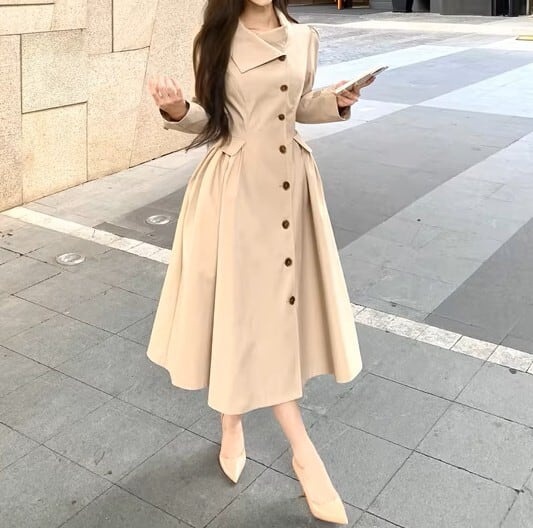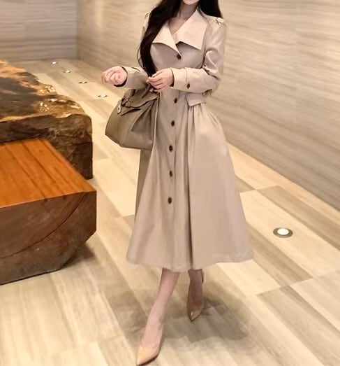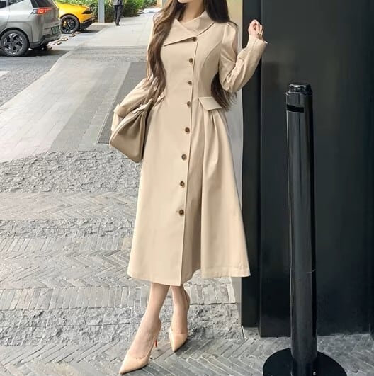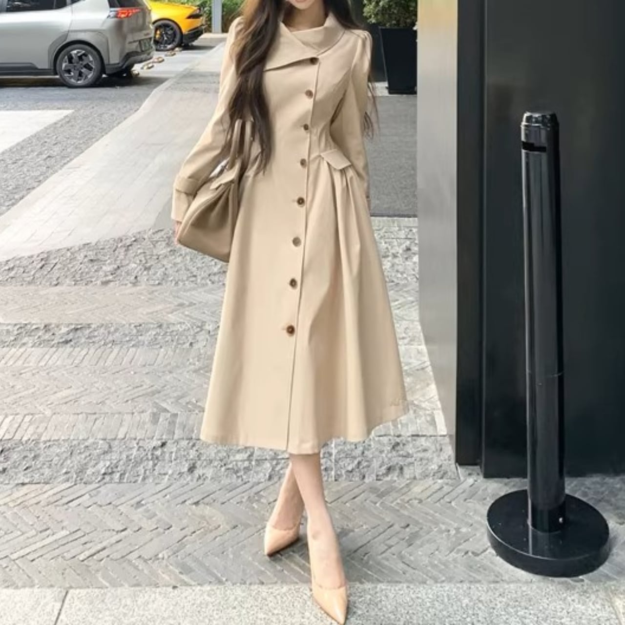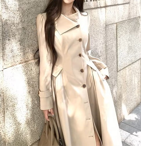 羽織るだけでフェミニンな雰囲気が漂うアシンメトリックカラーエレガントスイングロングトレンチドレス。