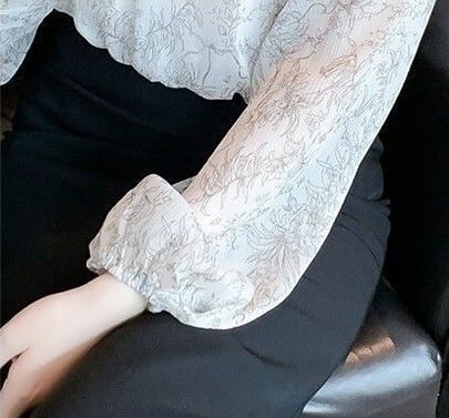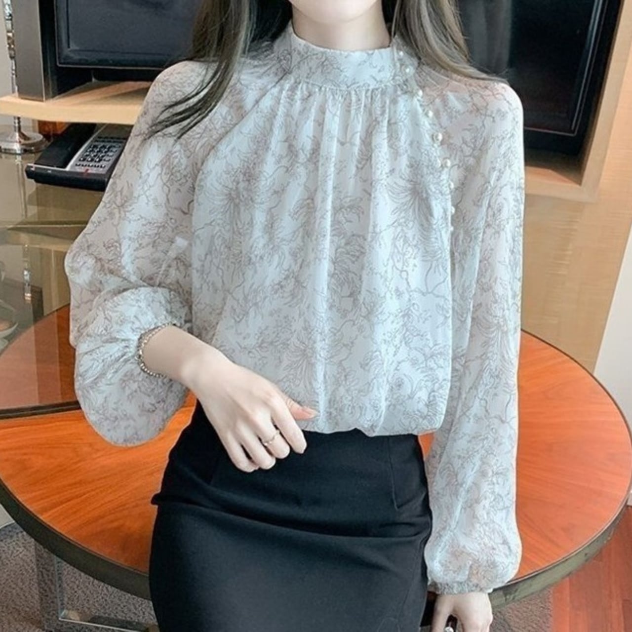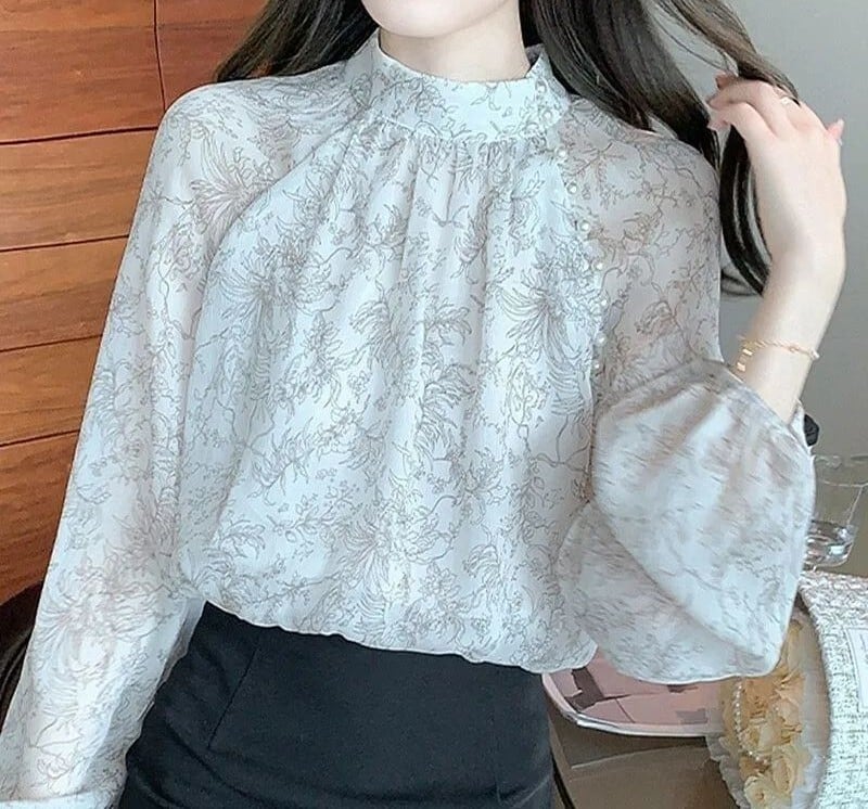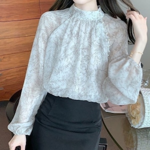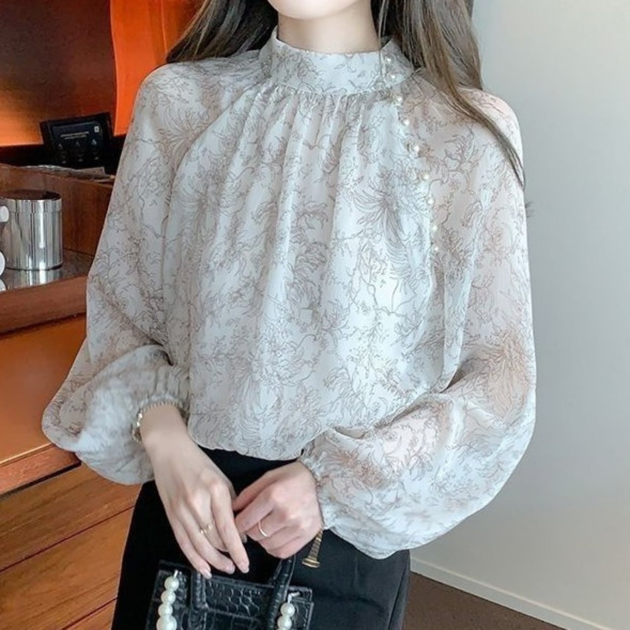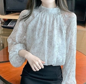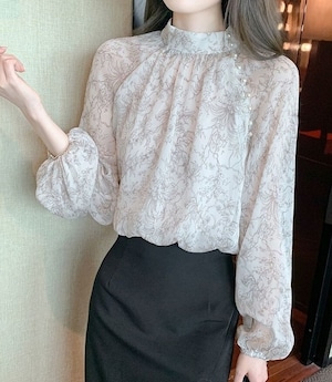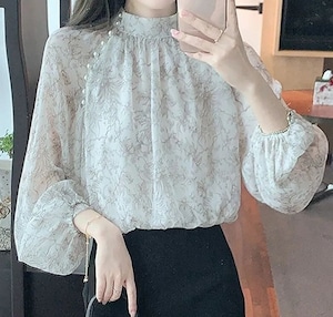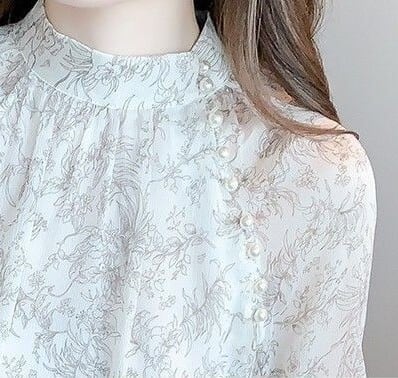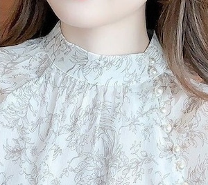 着用するだけでフェミニンな雰囲気が漂うチェストパールエレガントフローラルシフォンシャツ。