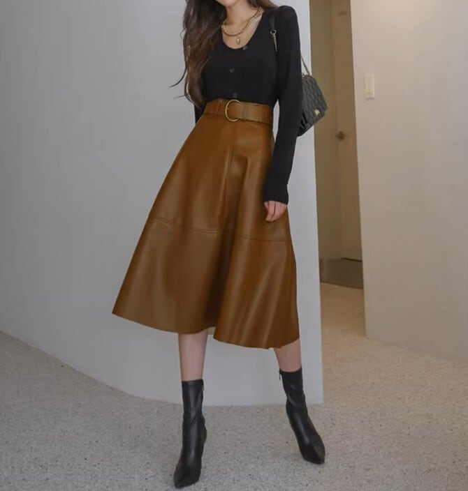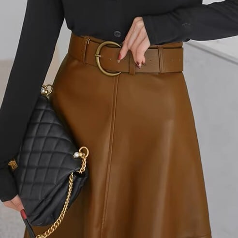 着用するだけでフェミニンな雰囲気が漂うハイウエストエレガントストラップスイングpuレザースカート。