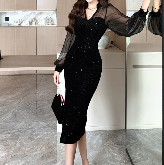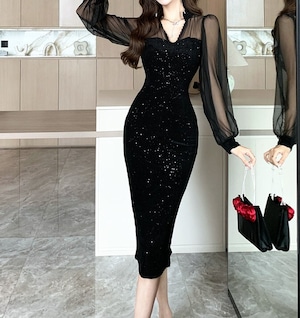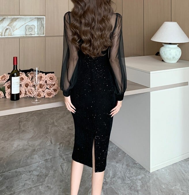 着用するだけでフェミニンな雰囲気が漂うメッシュステッチエレガントスパンコールスリムドレス。