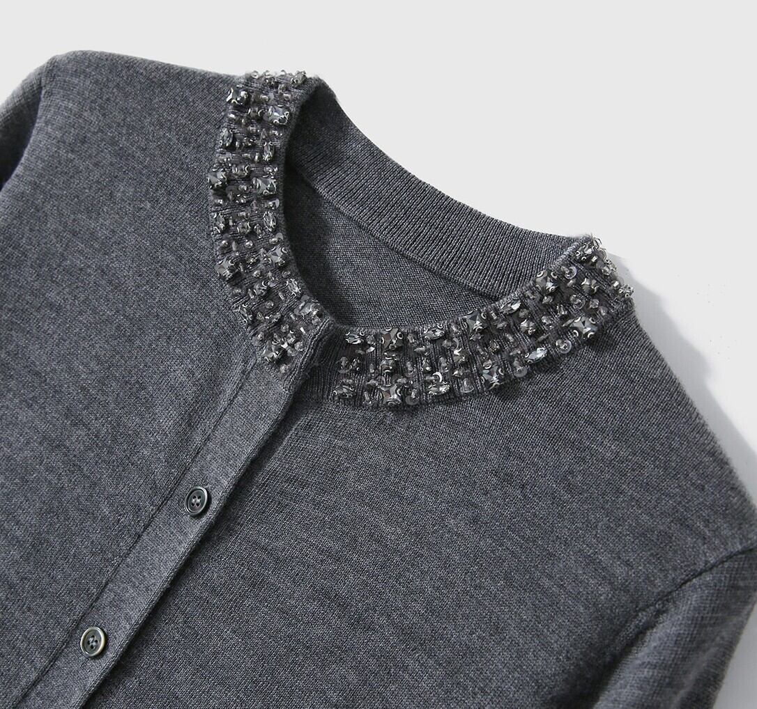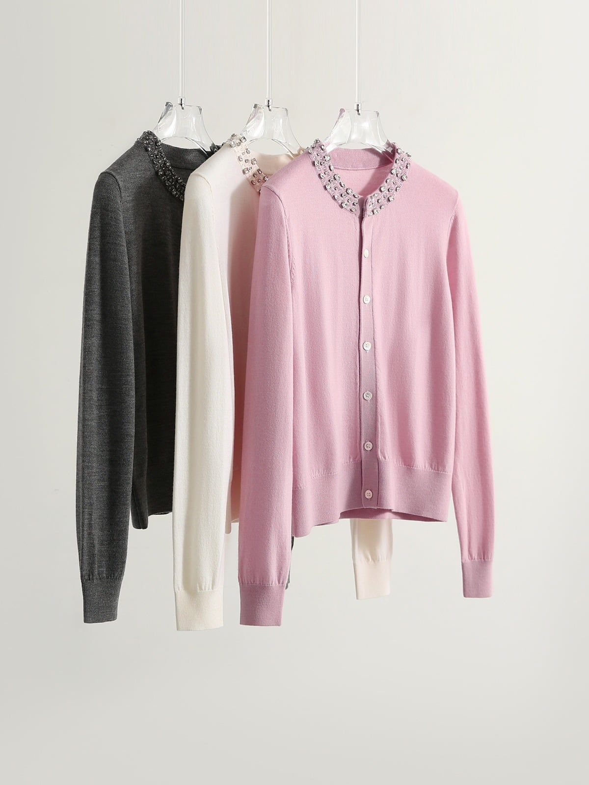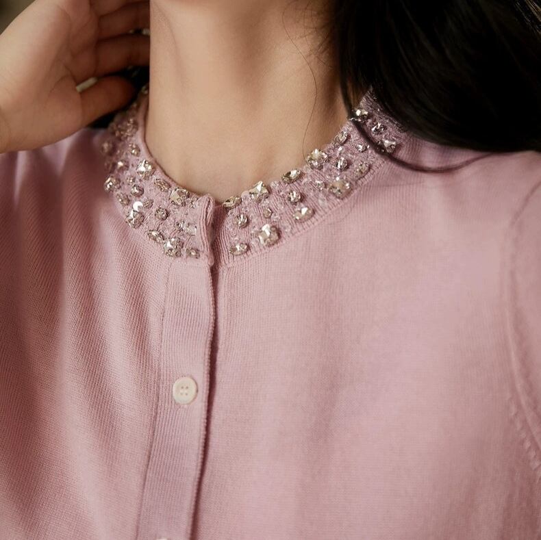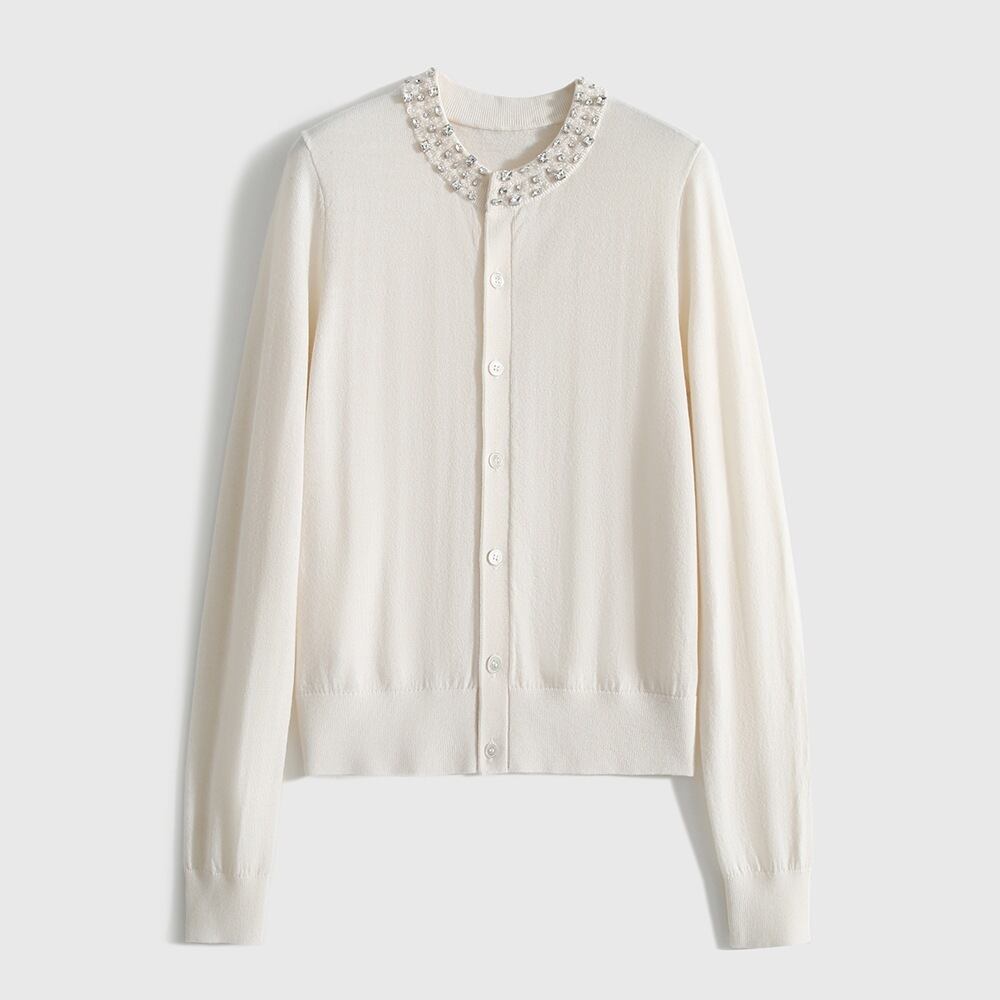 着用するだけでフェミニンな雰囲気が漂うビーズステッチエレガントスリムニットカーディガン。