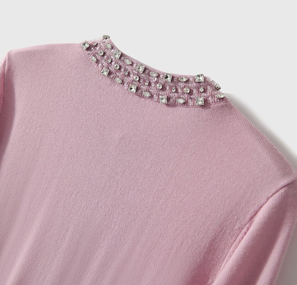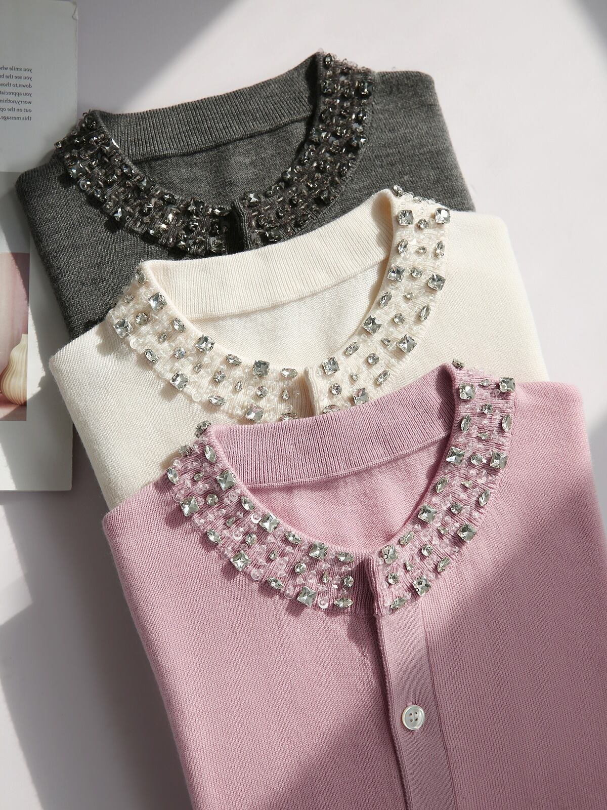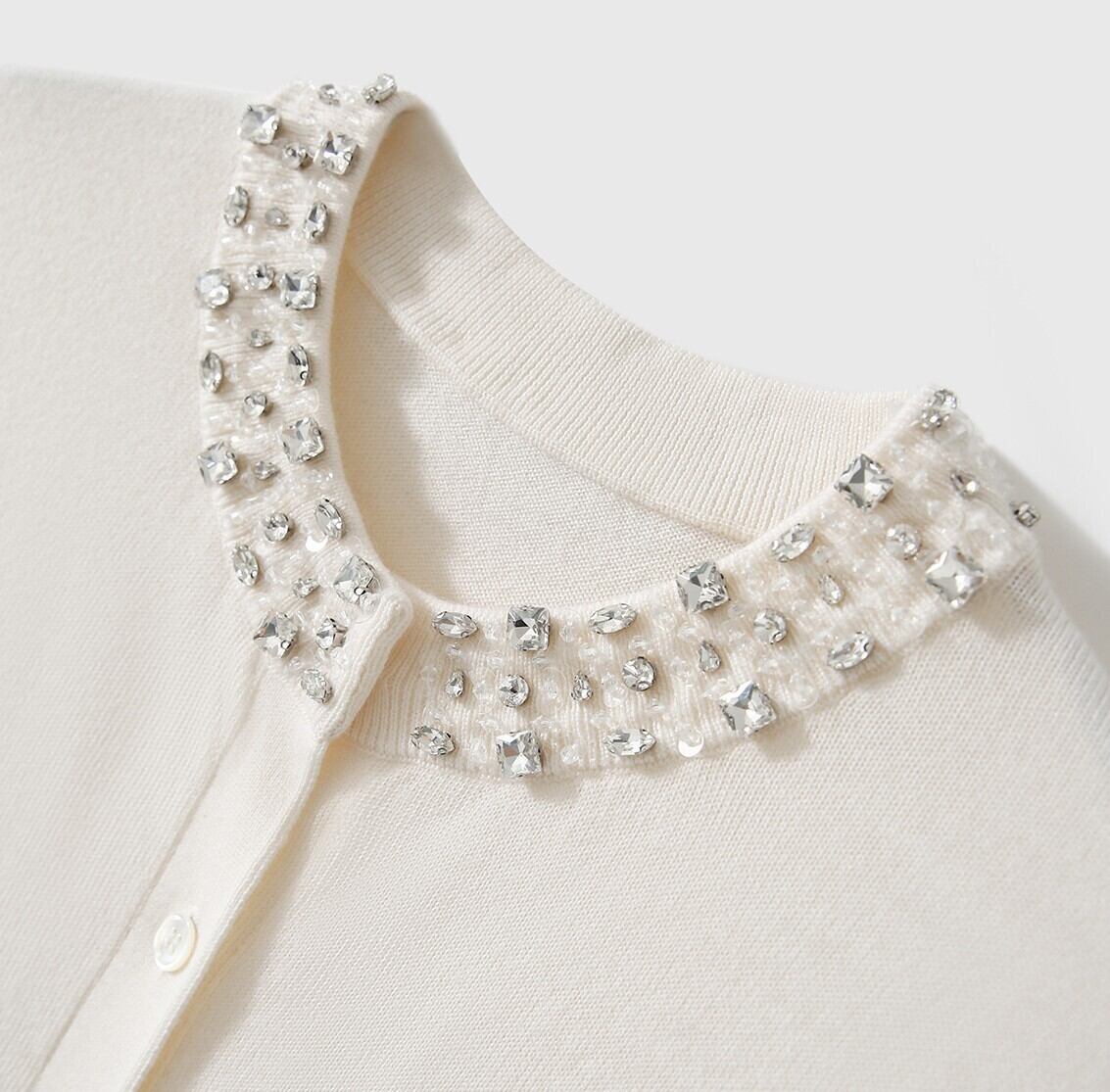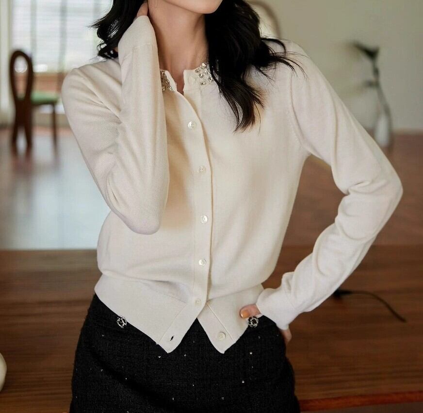 着用するだけでフェミニンな雰囲気が漂うビーズステッチエレガントスリムニットカーディガン。