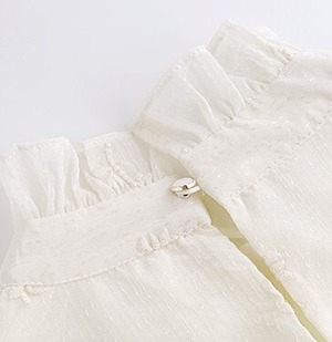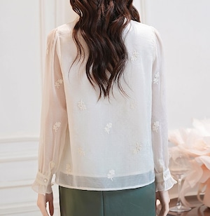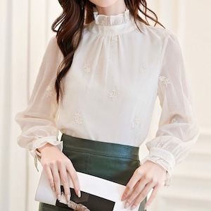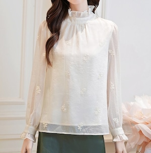 着用するだけで大人可愛い雰囲気が漂うスタンドカラーエレガントメッシュステッチシフォンシャツ。
