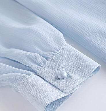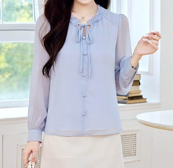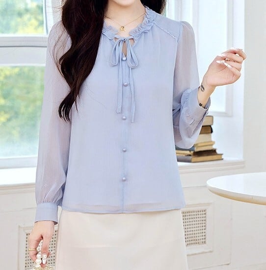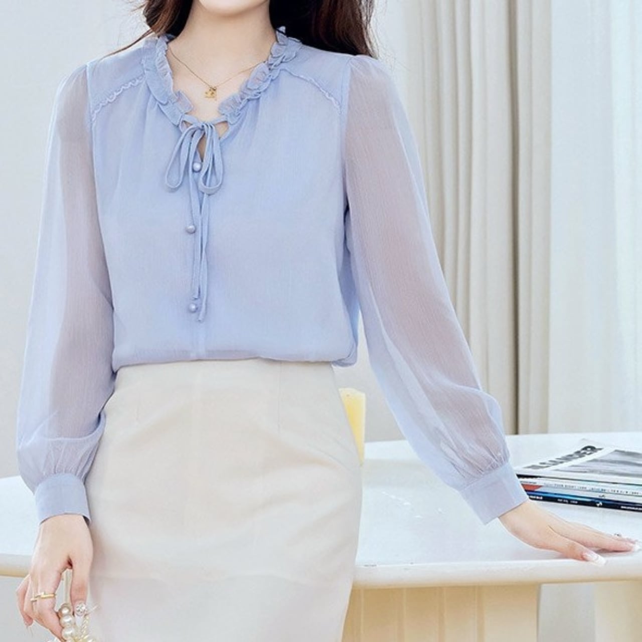 着用するだけで大人可愛い雰囲気が漂うラッフルカラーエレガントチェストリボンシフォンブラウス。