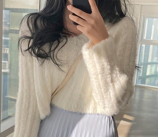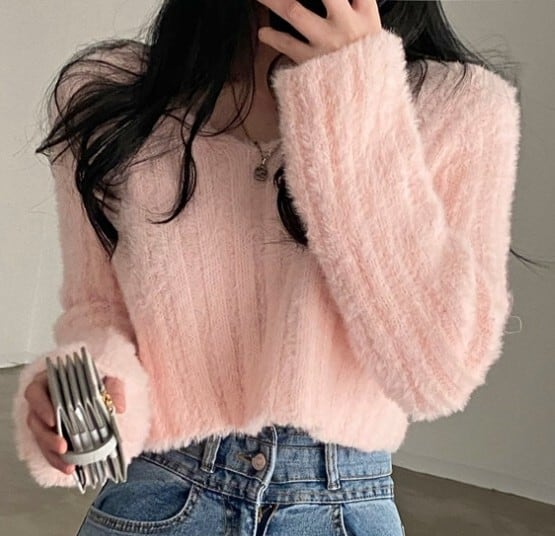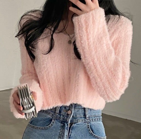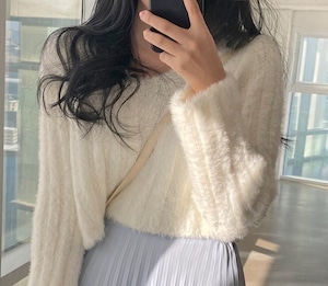 V neck elegant fluffy short knit ( 4color )