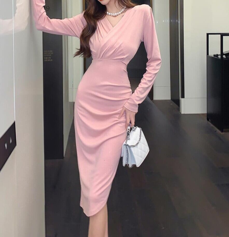 Cross v neck elegant slim middle dress