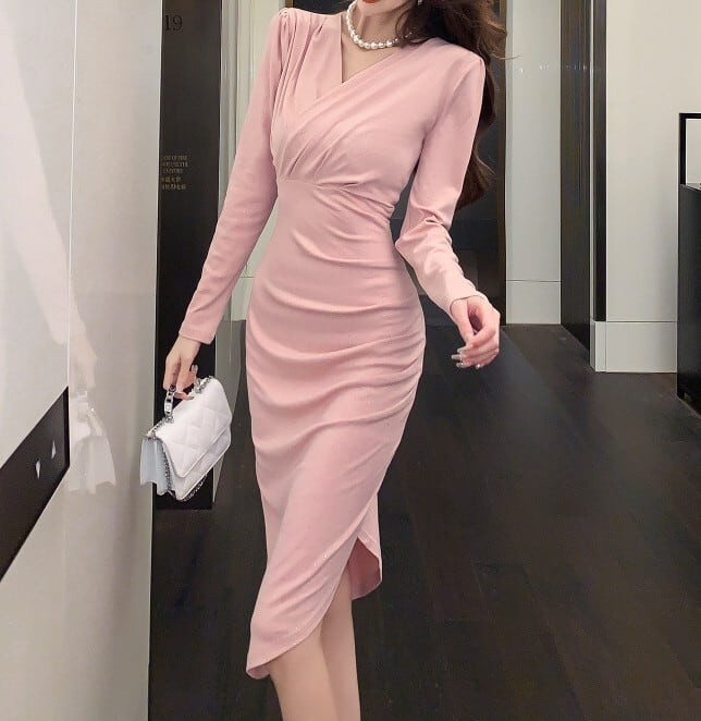 着用するだけでフェミニンな雰囲気が漂うクロスVネックエレガントスリムミドルドレス。