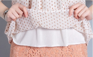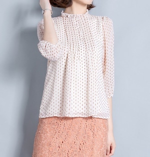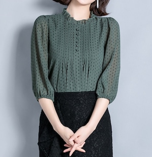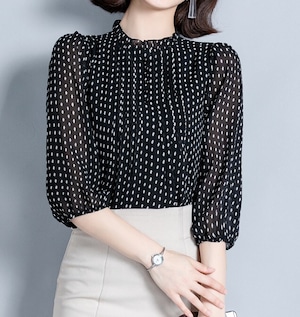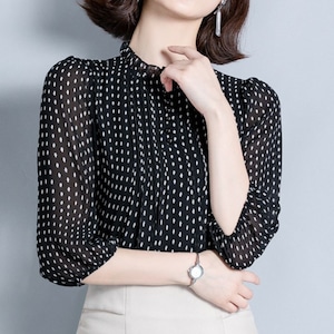 着用するだけで大人可愛い雰囲気が漂うスタンドカラーエレガントスリークオータースリーブポルカドットシフォンシャツ。