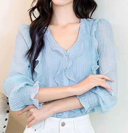 着用するだけで大人可愛い雰囲気が漂うVネックエレガントラッフルステッチシフォンブラウス。