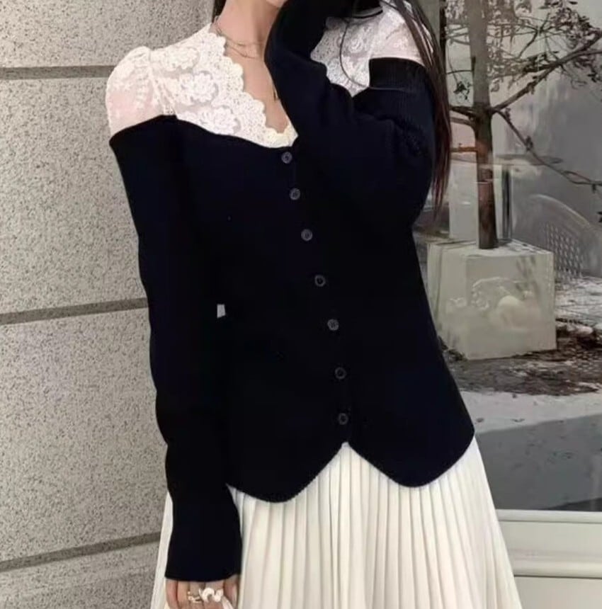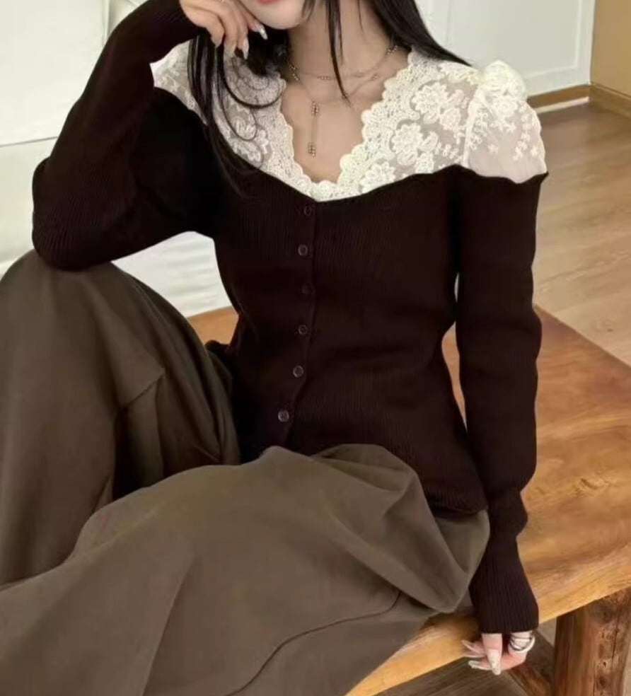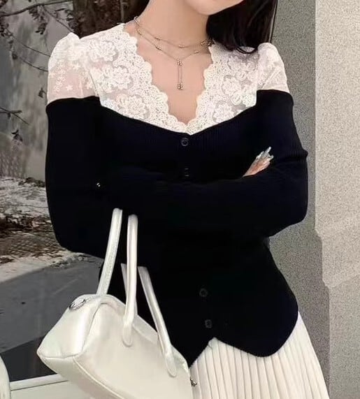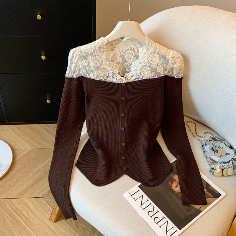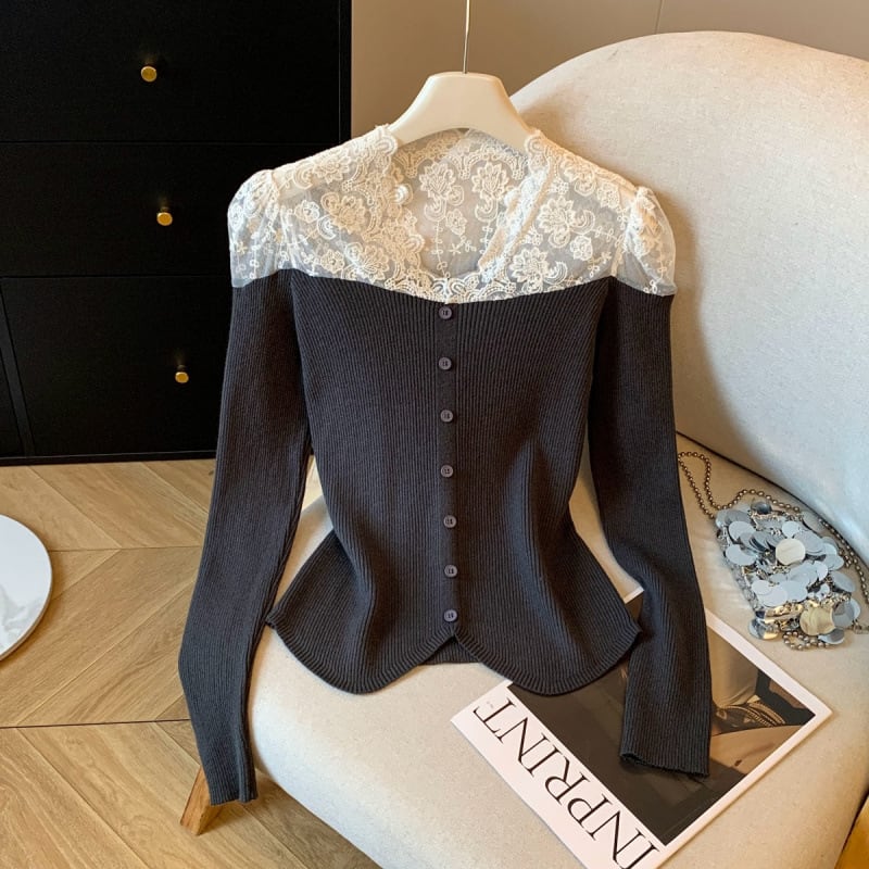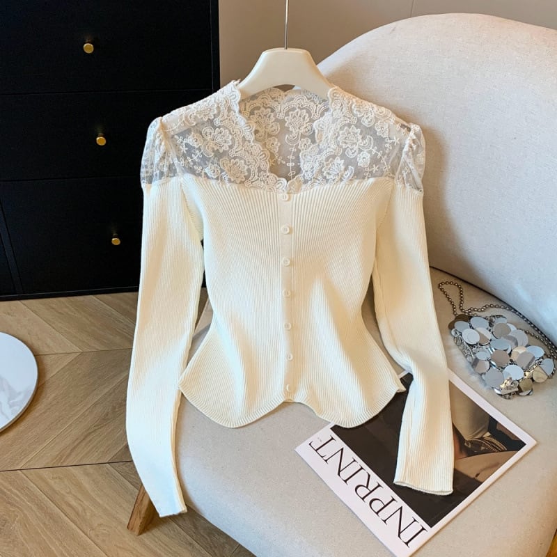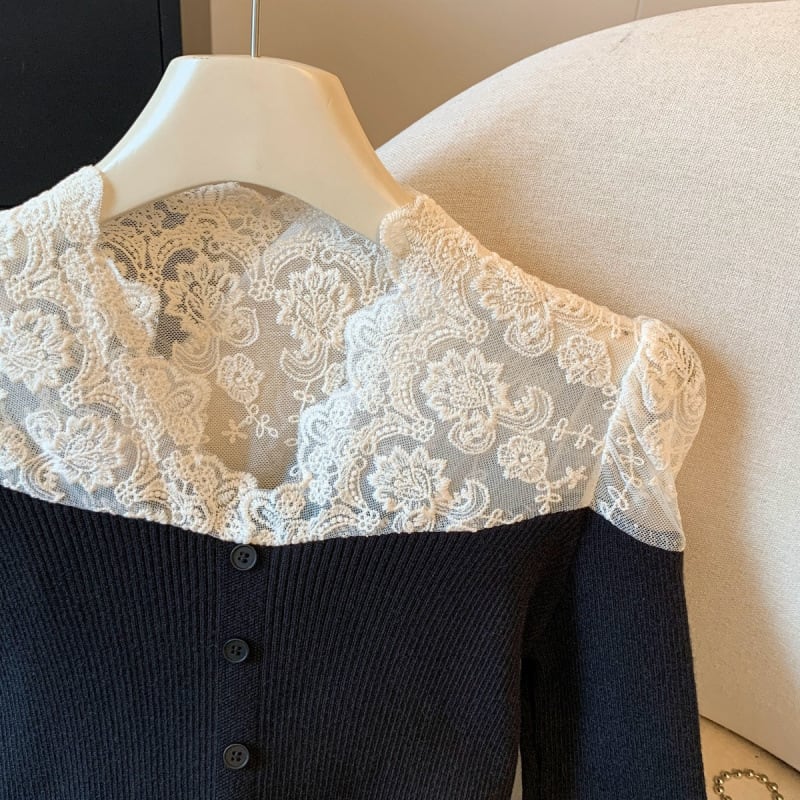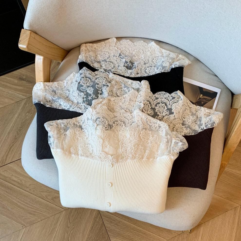 着用するだけで大人可愛い雰囲気が漂うシングルブレストエレガントレースステッチスリムニット。