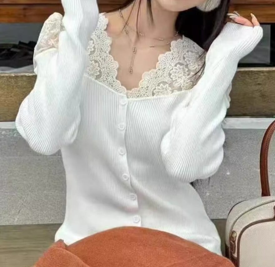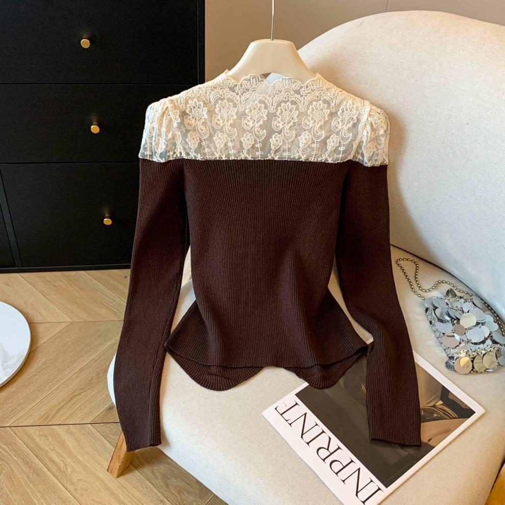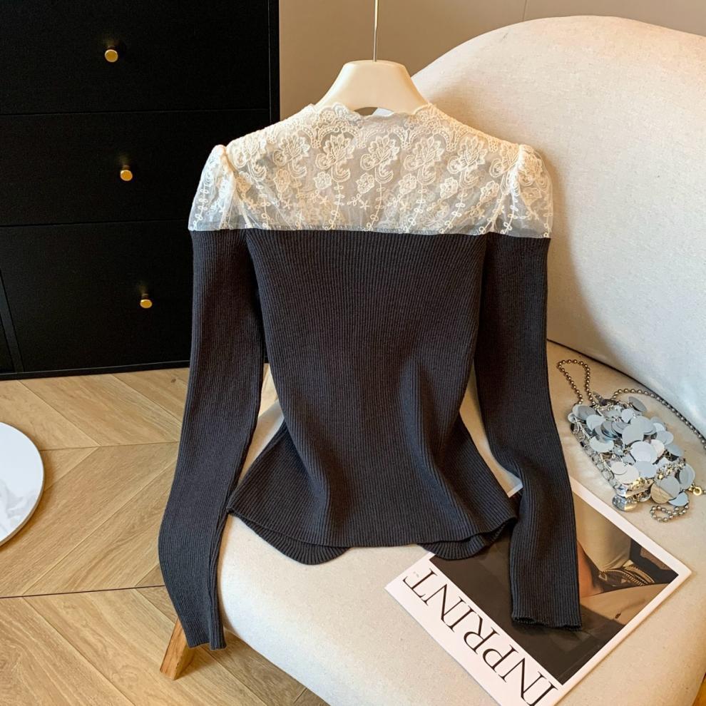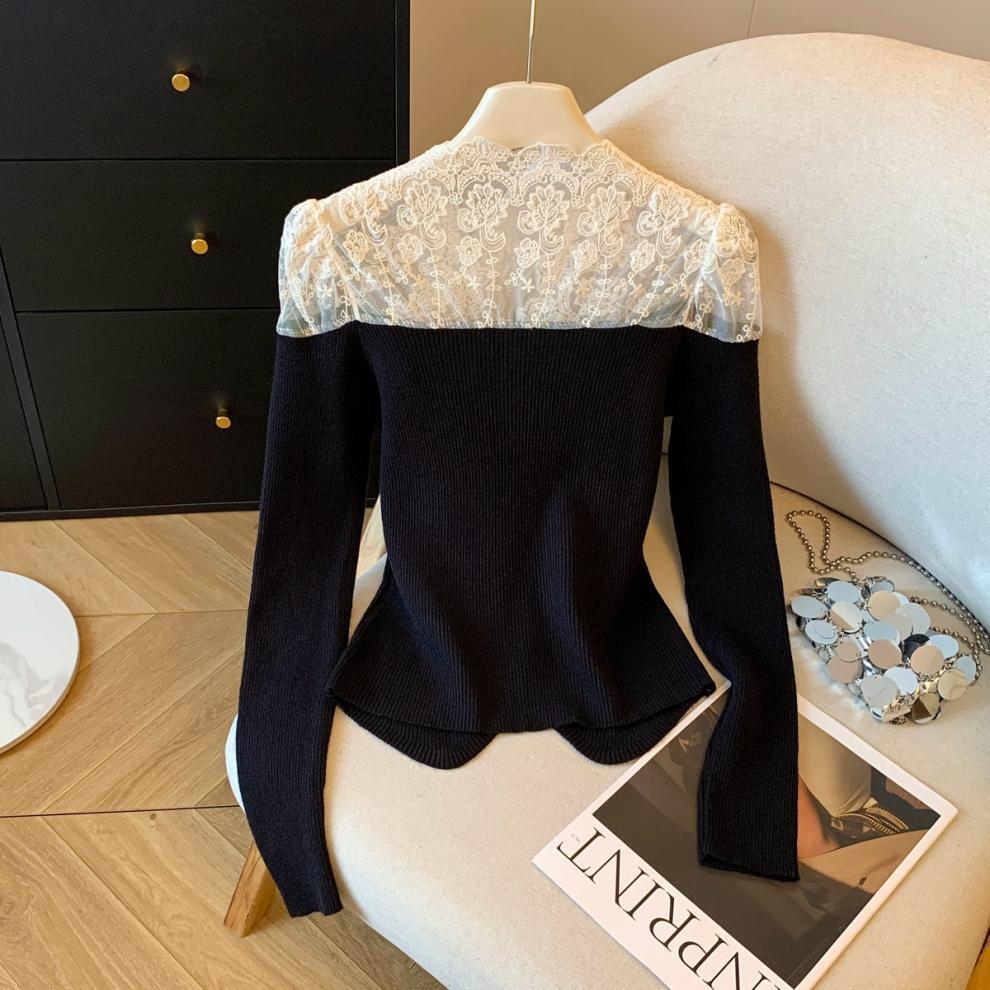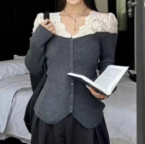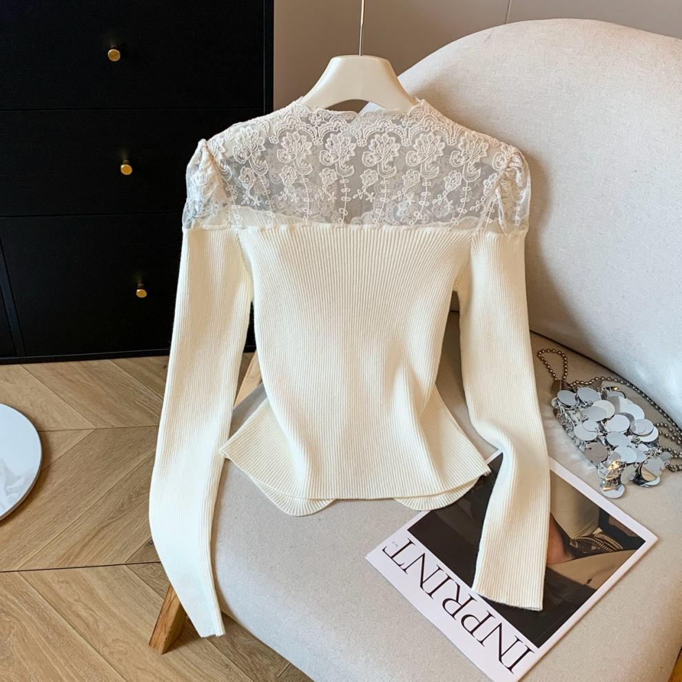 着用するだけで大人可愛い雰囲気が漂うシングルブレストエレガントレースステッチスリムニット。