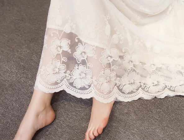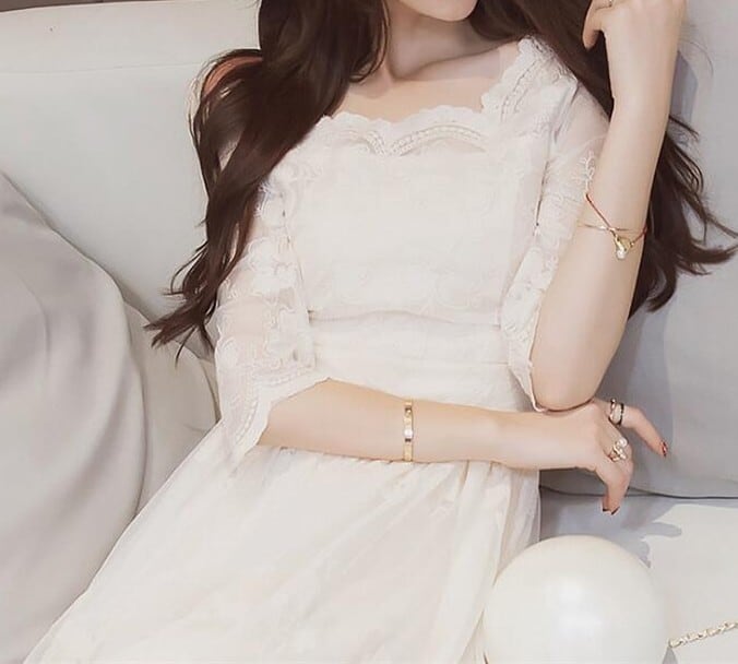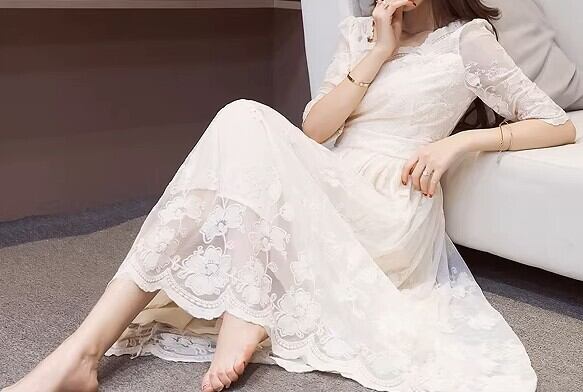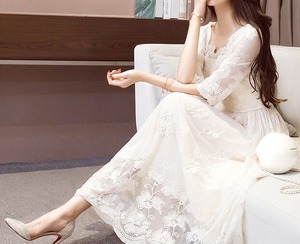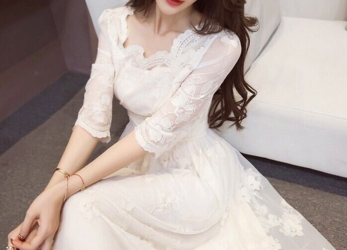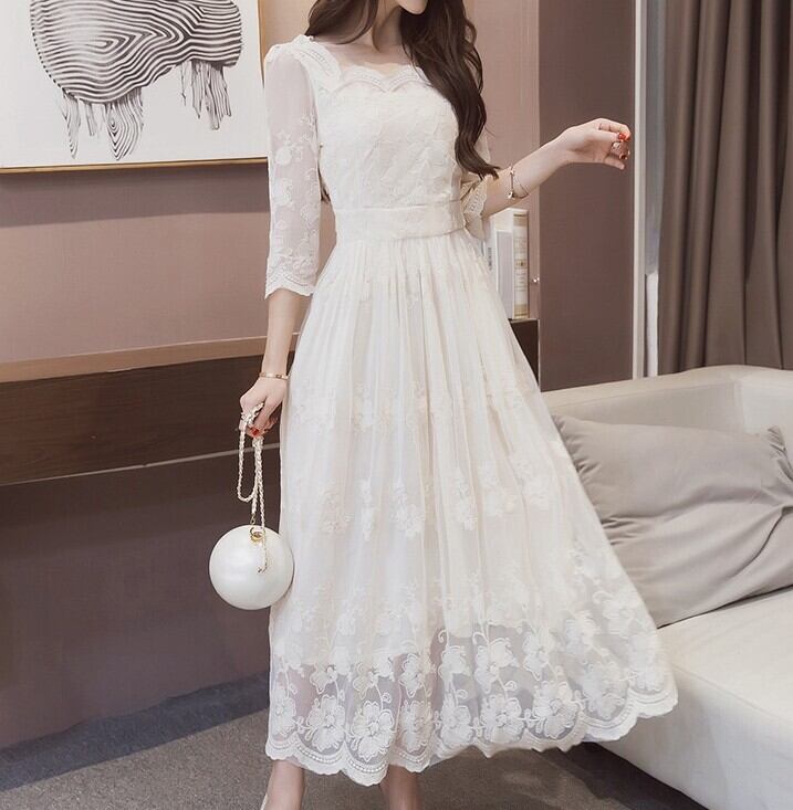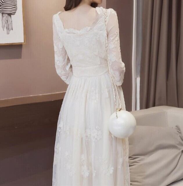 着用するだけでフェミニンな雰囲気が漂うスクエアカラーエレガントハーフスリーブフローラルレースロングドレス。