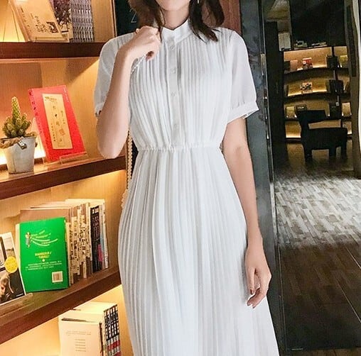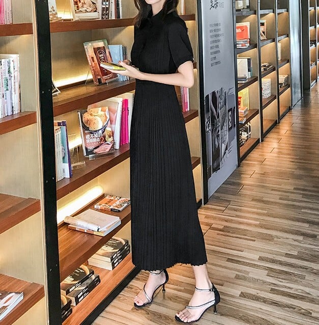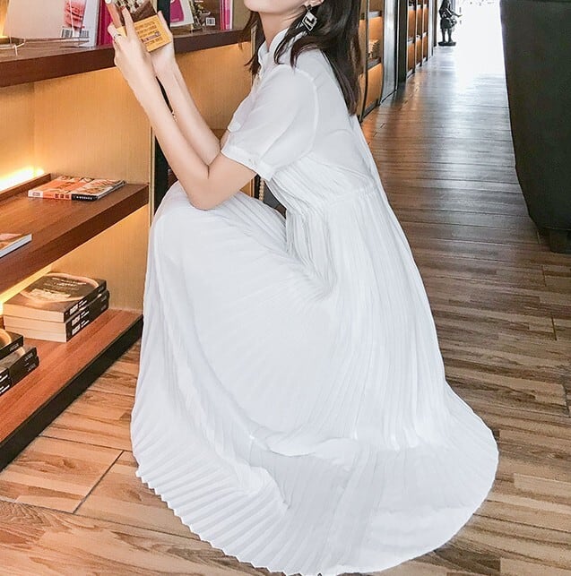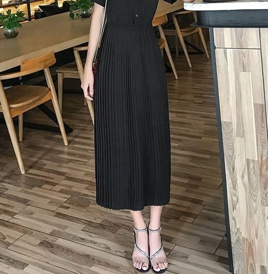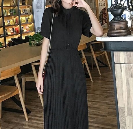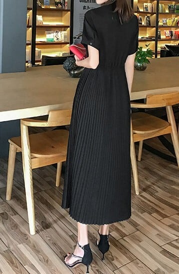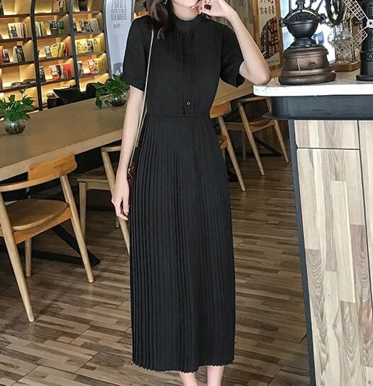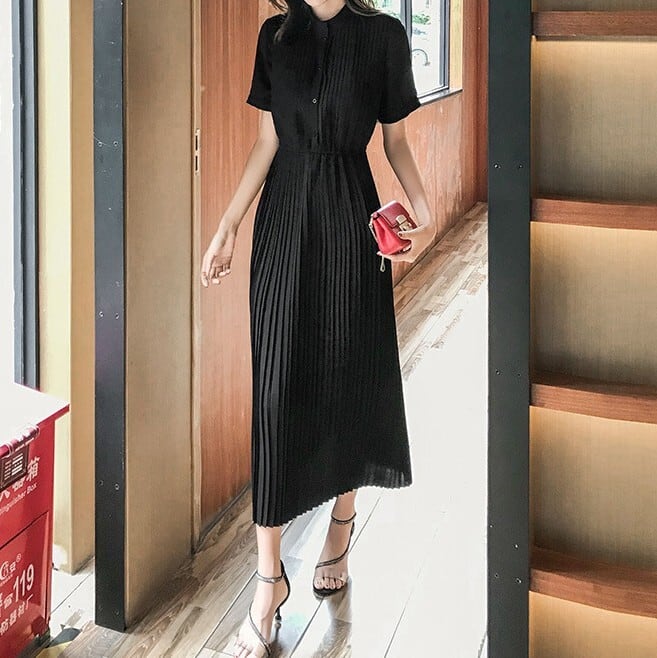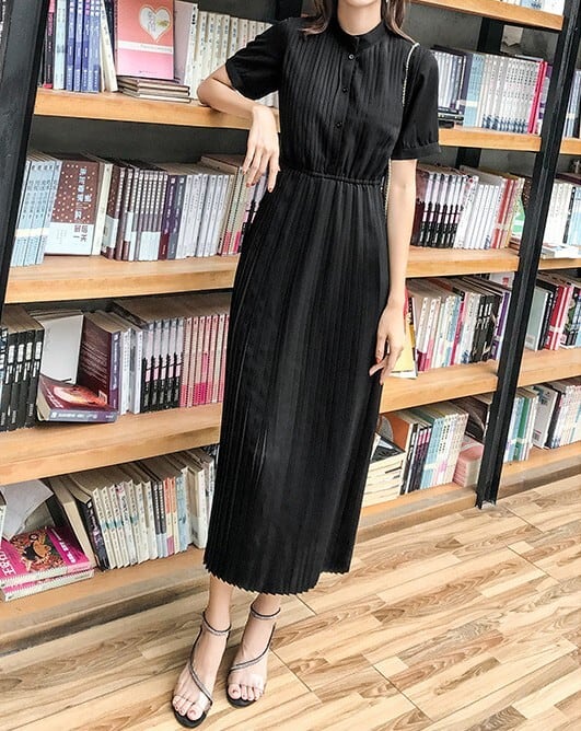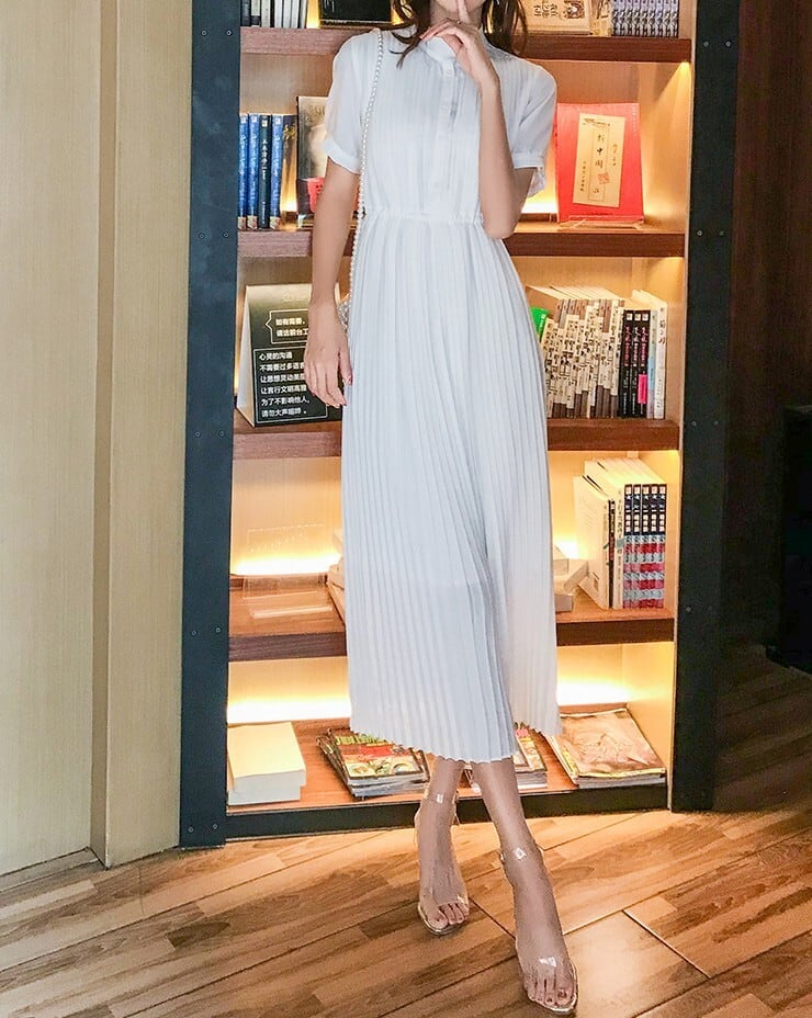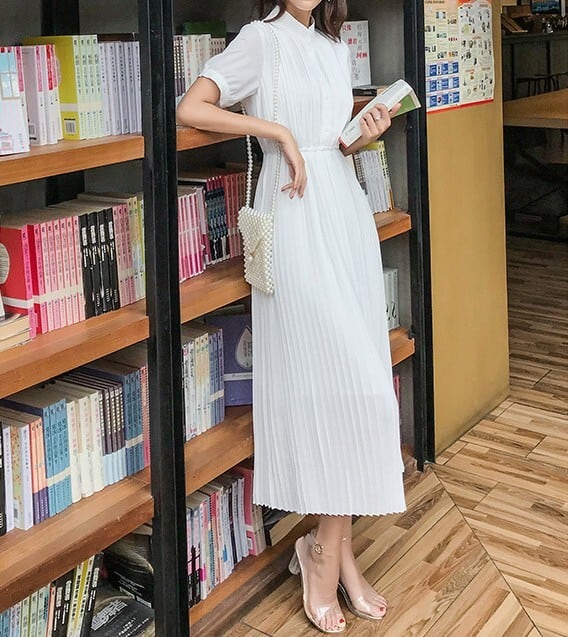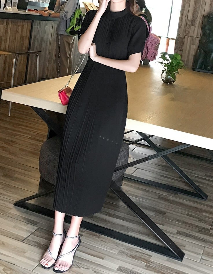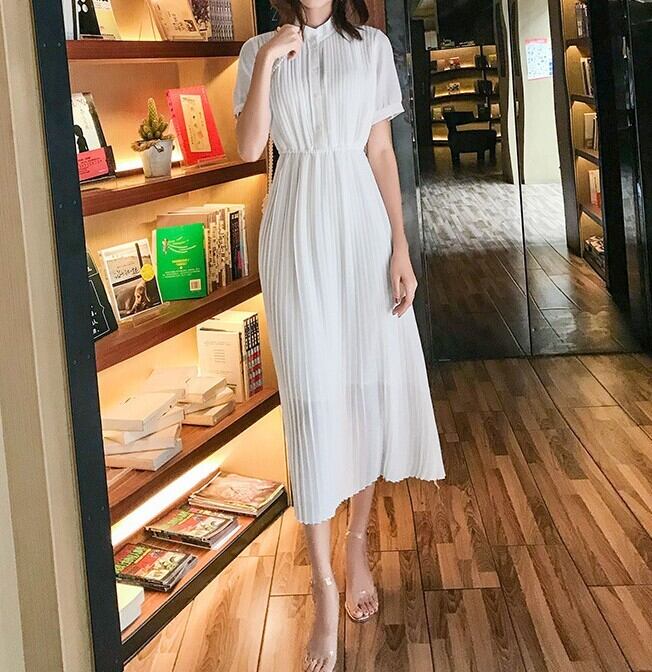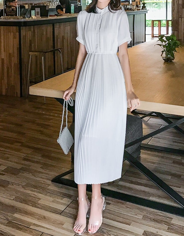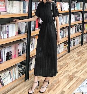 Stand collar elegant waist fit long pleats chiffon dress ( 2color )