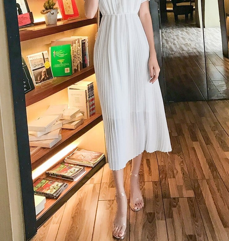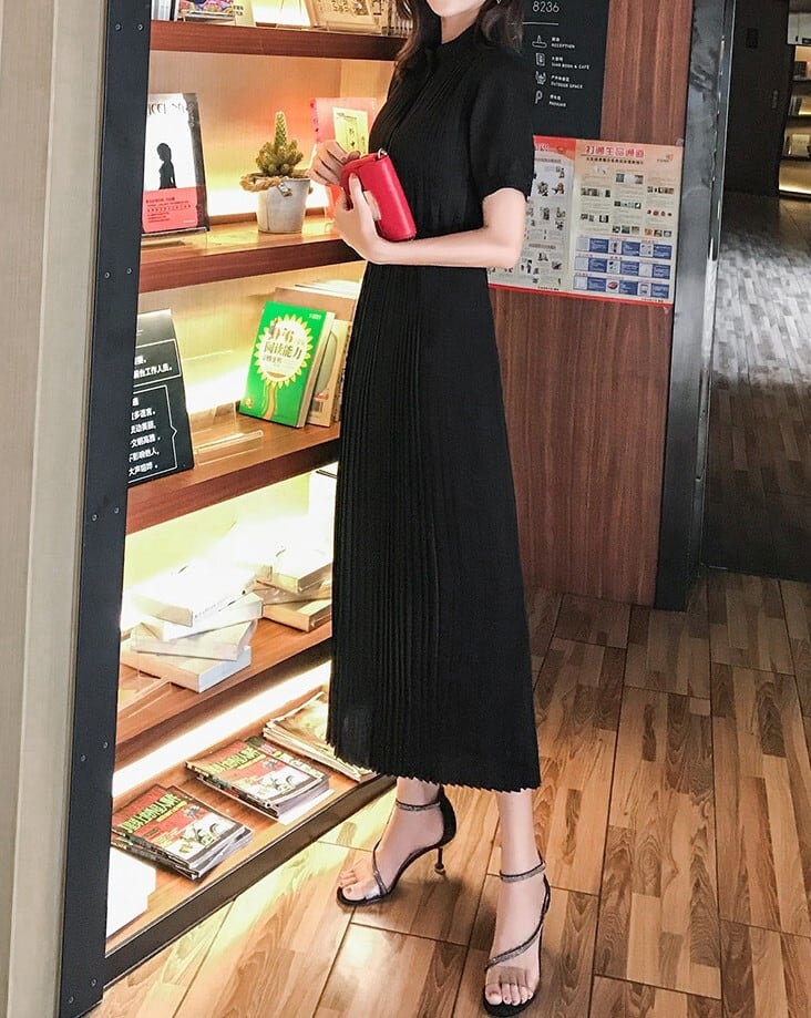 着用するだけでフェミニンな雰囲気が漂うエレガントスタンドカラーエレガントウエストフィットロングプリーツシフォンドレス。