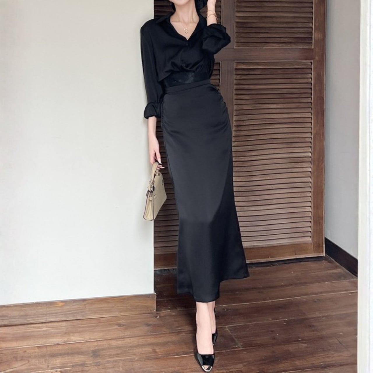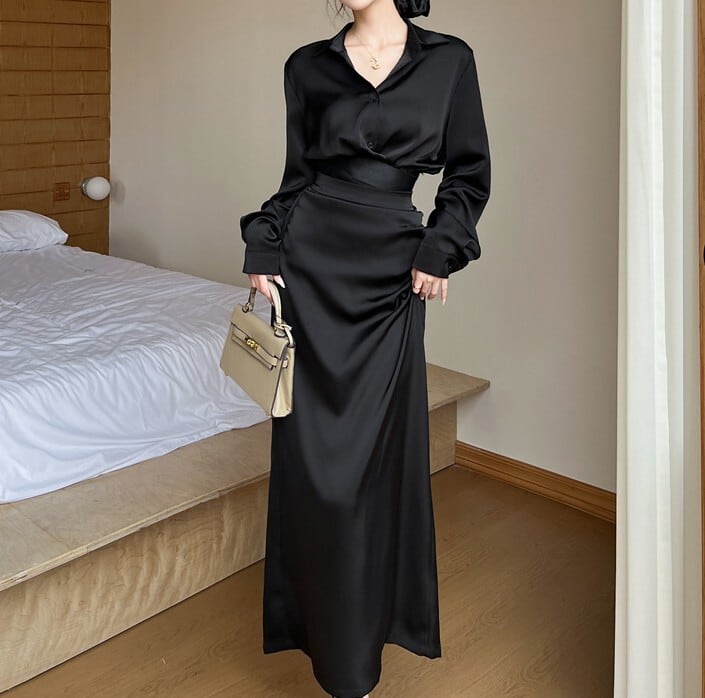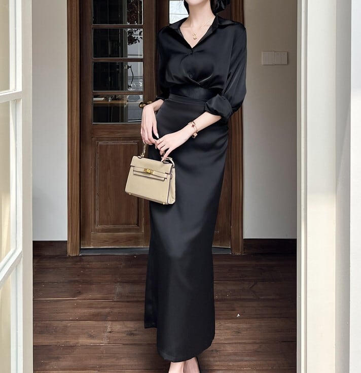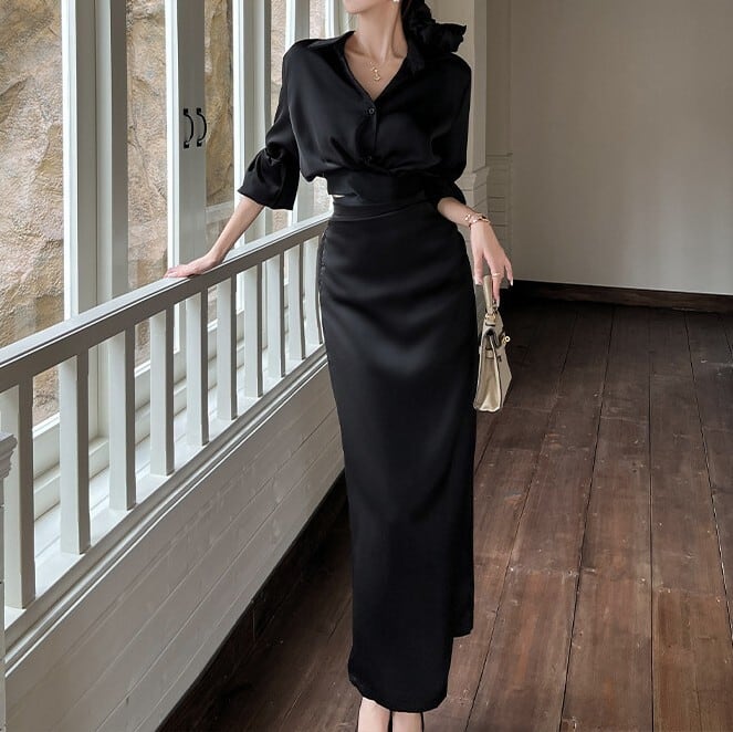 ポロカラーシングルブレストスリムシャツとバックスリットロングスリムスカートのセット商品です。