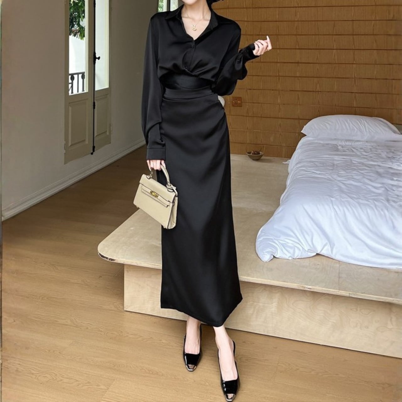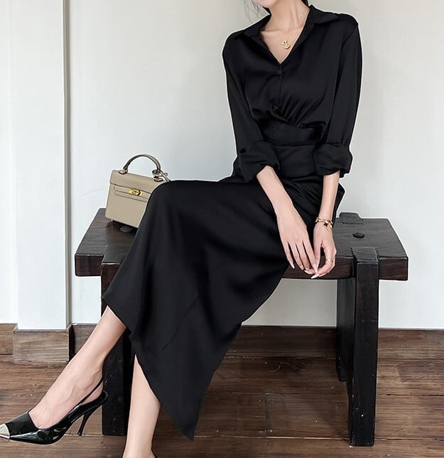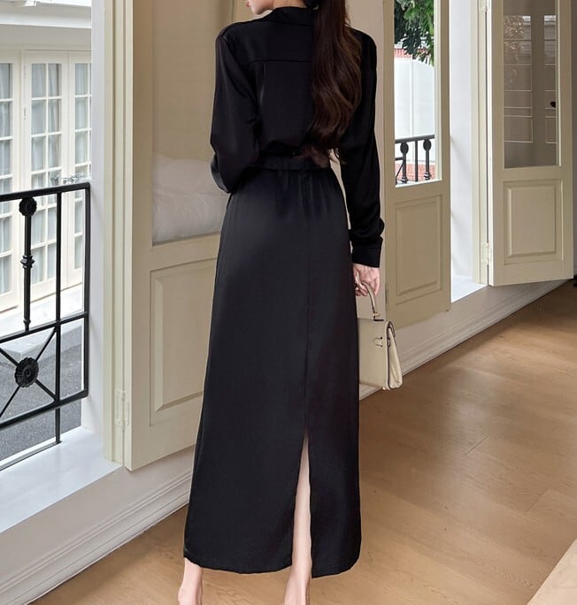 着用するだけでフェミニンな雰囲気が漂うポロカラーエレガントウエストスリムロングシャツドレスセットアップ。
