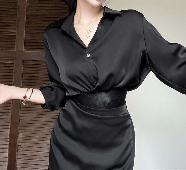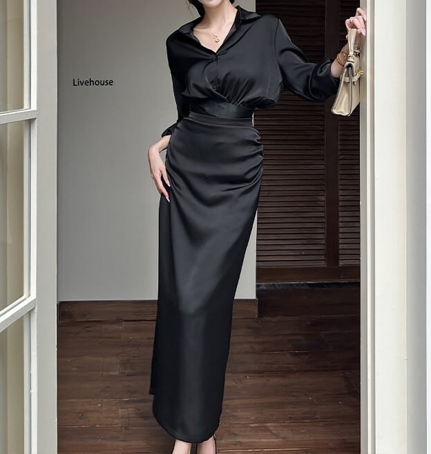 Polo collar elegant waist slim long shirt dress set up