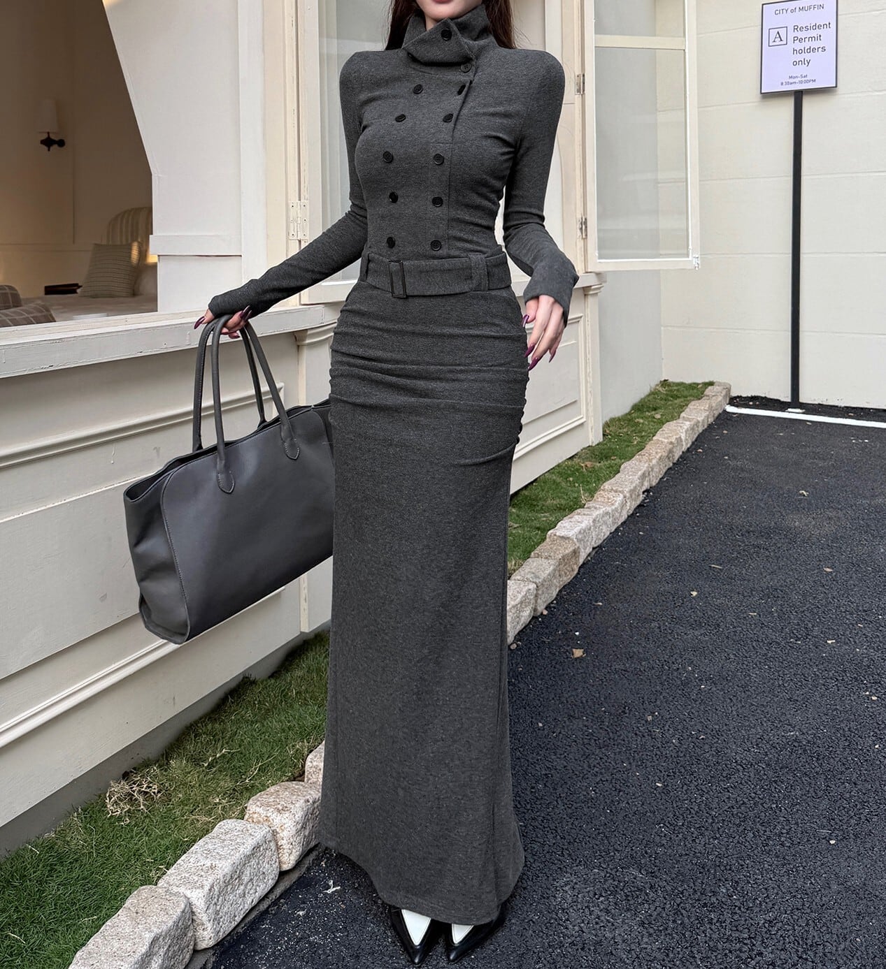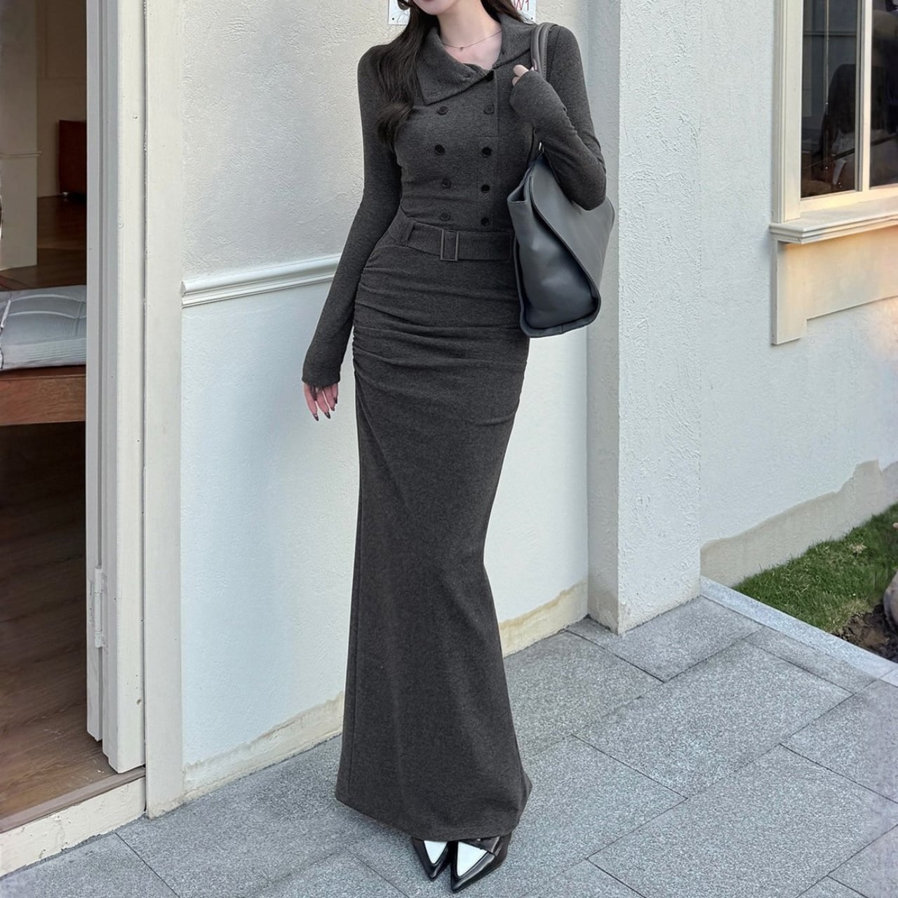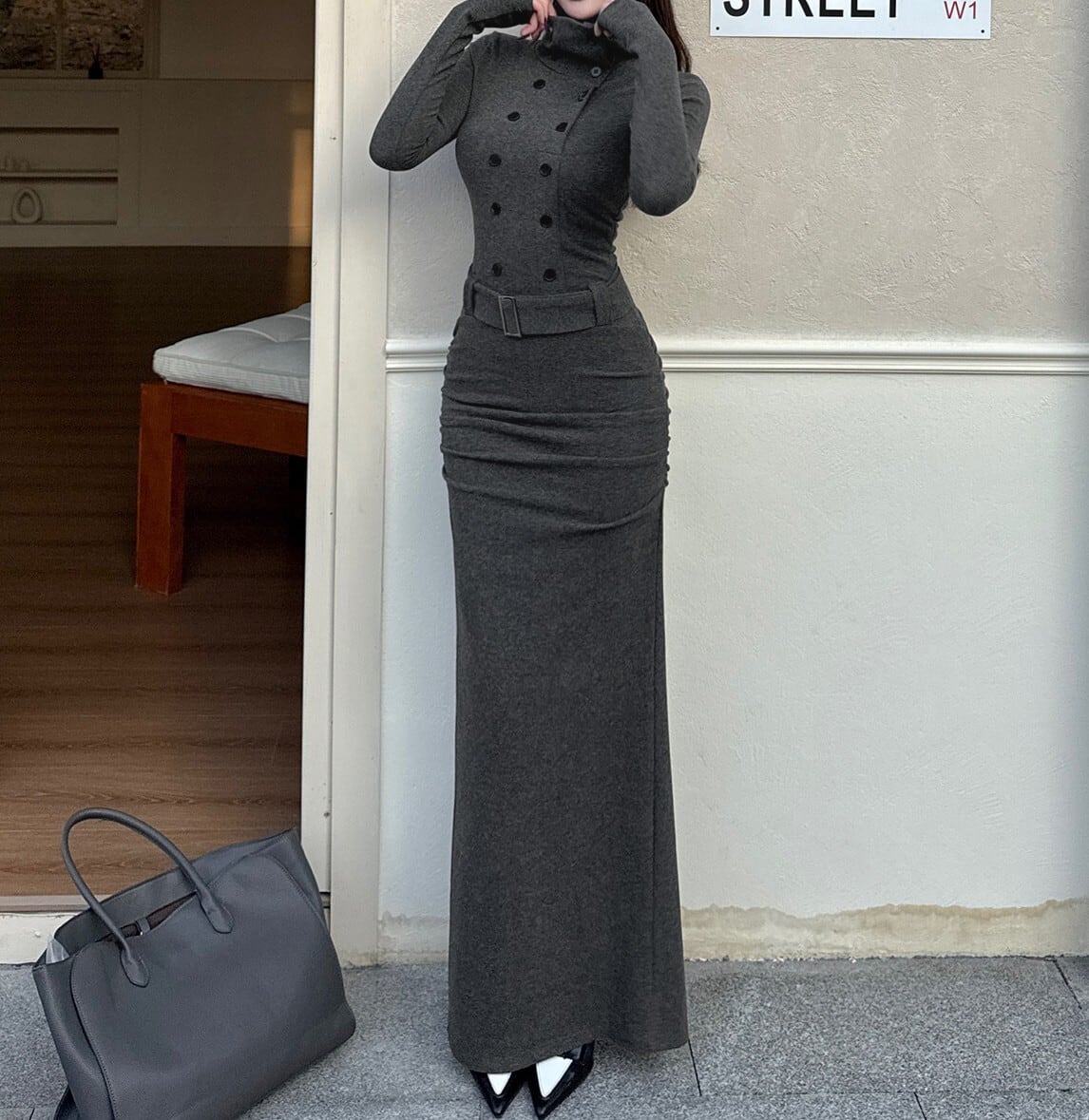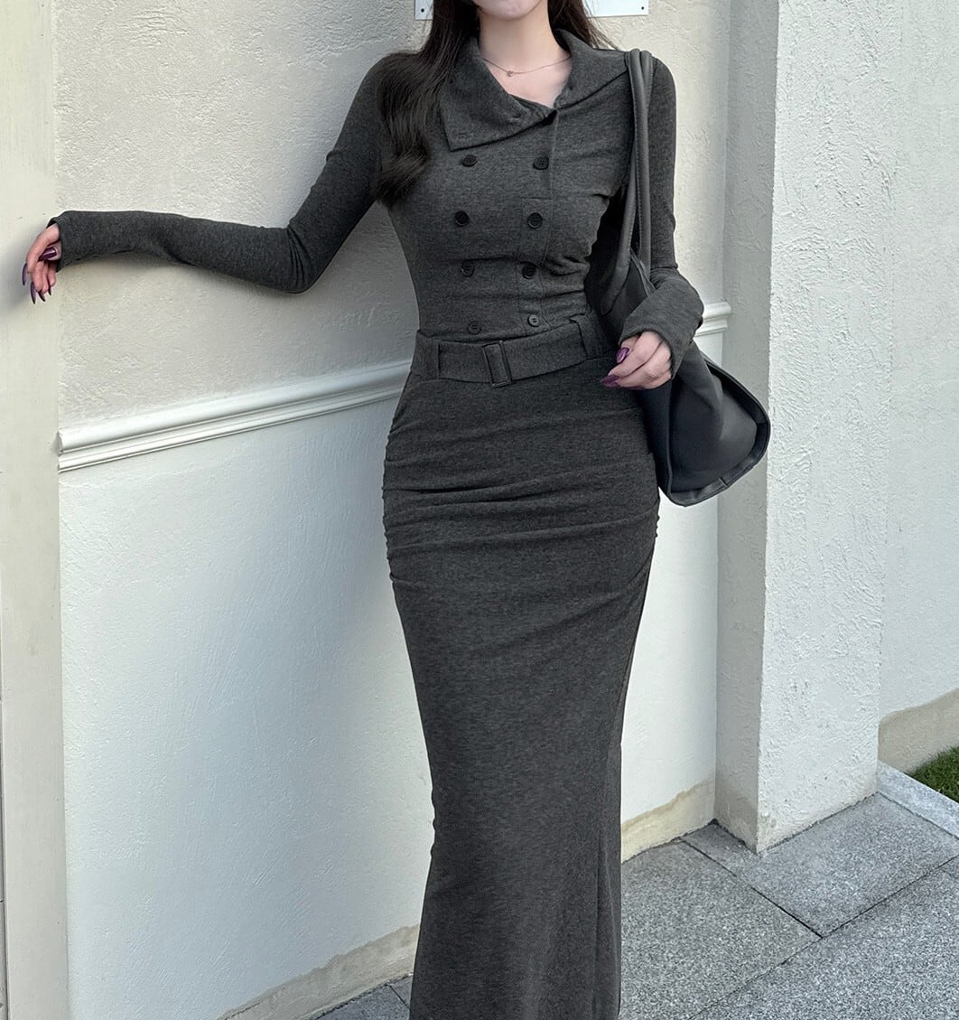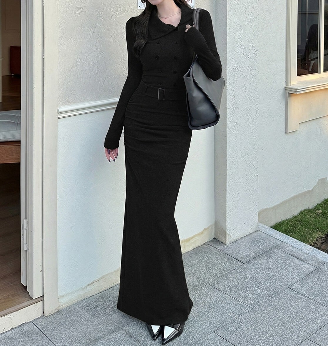 着用するだけでフェミニンな雰囲気が漂うスタンドカラーエレガントダブルブレストストラップロングニットドレス。