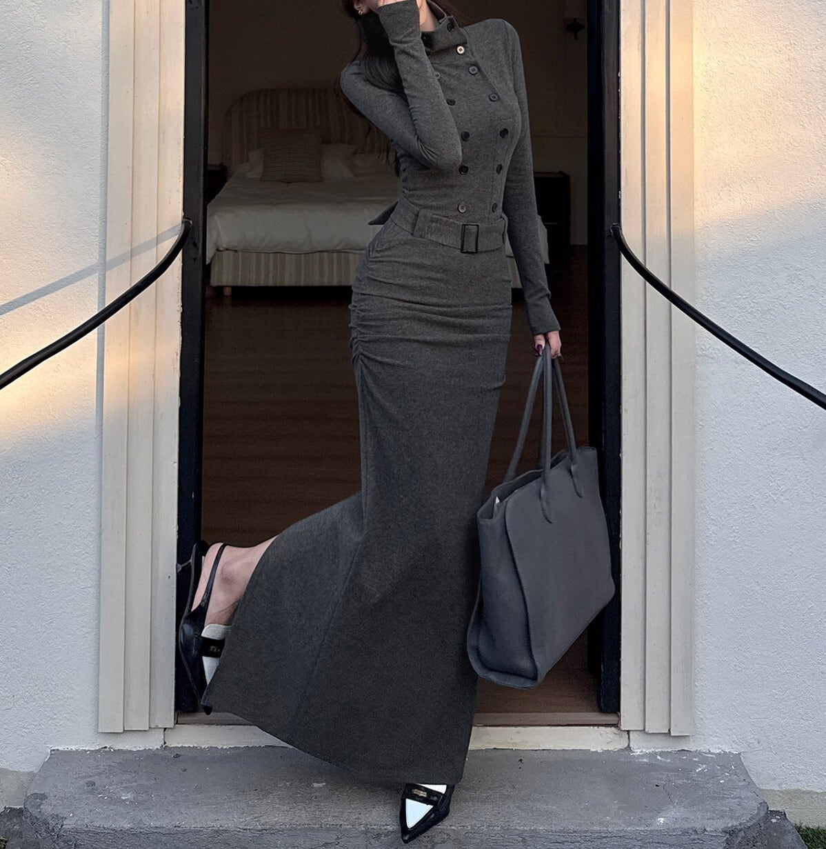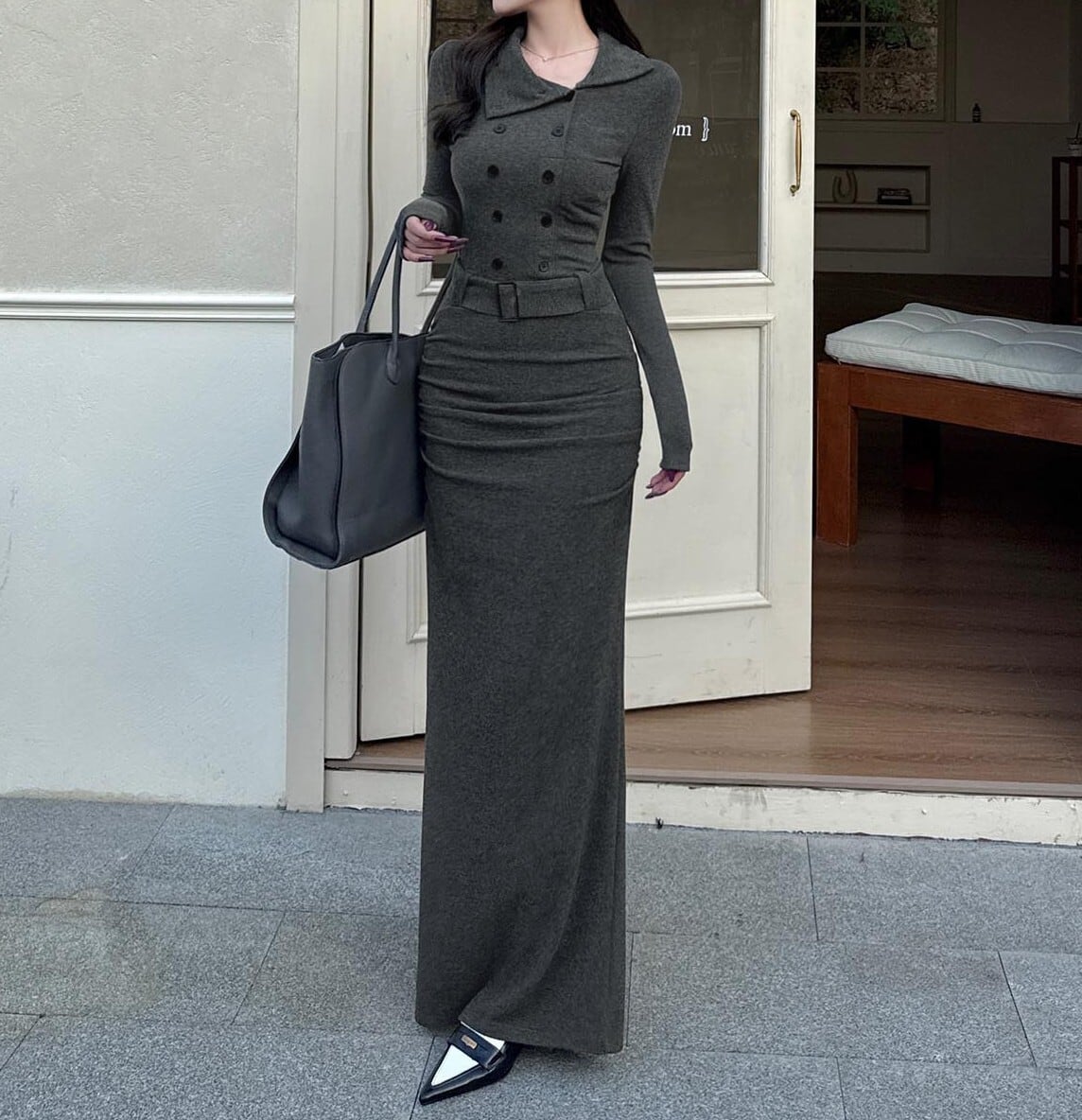 Stand collar elegant double breast strap long knit dress ( 2color )