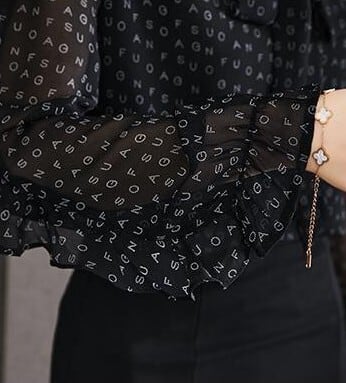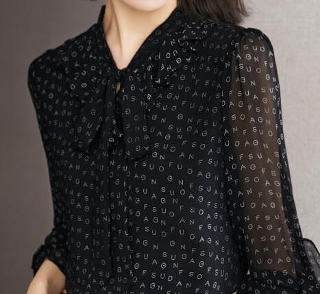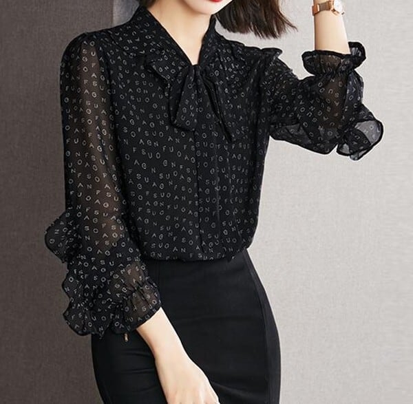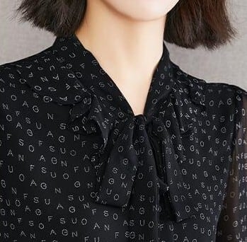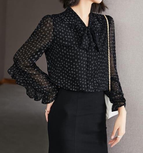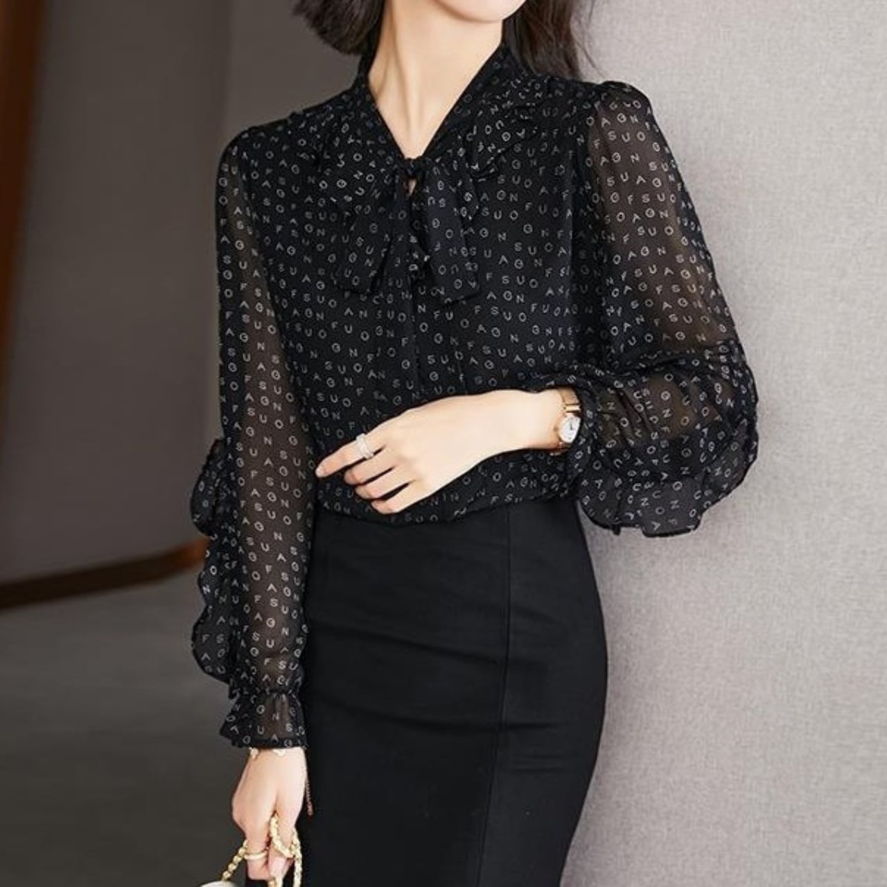 着用するだけでフェミニンな雰囲気が漂うチェストタイエレガントレターデザインシフォンシャツ。