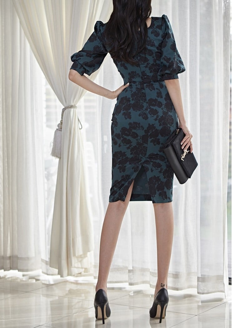 着用するだけでフェミニンな雰囲気が漂うスクエアカラーエレガントレトロフローラルスリム