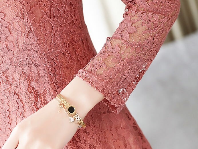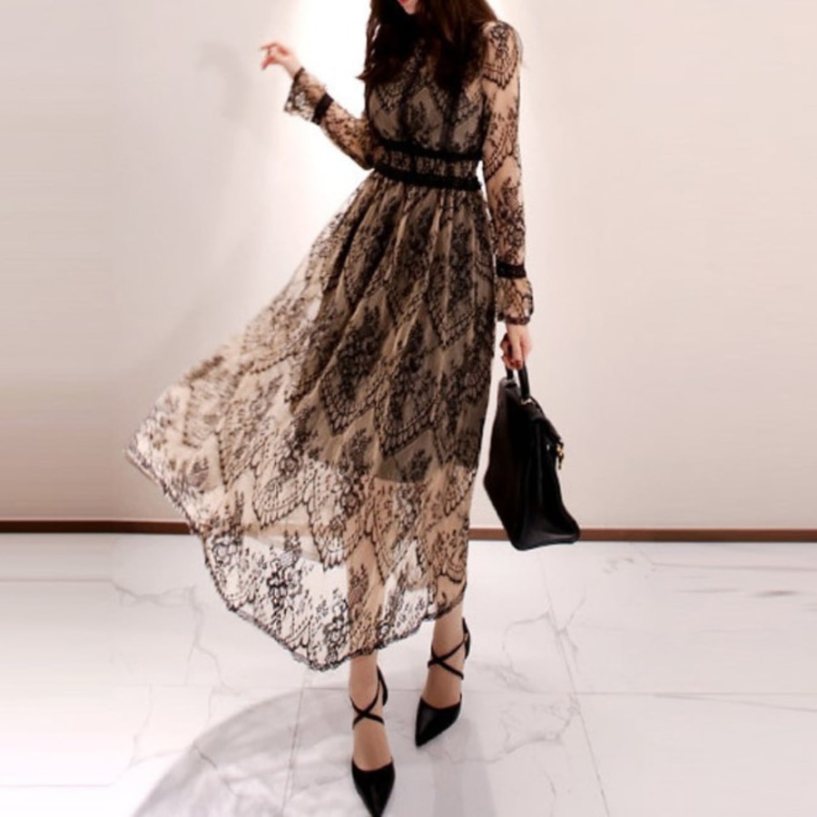 Stand collar elegant single breast flare long lace dress