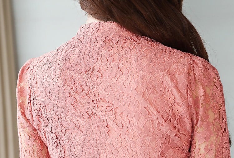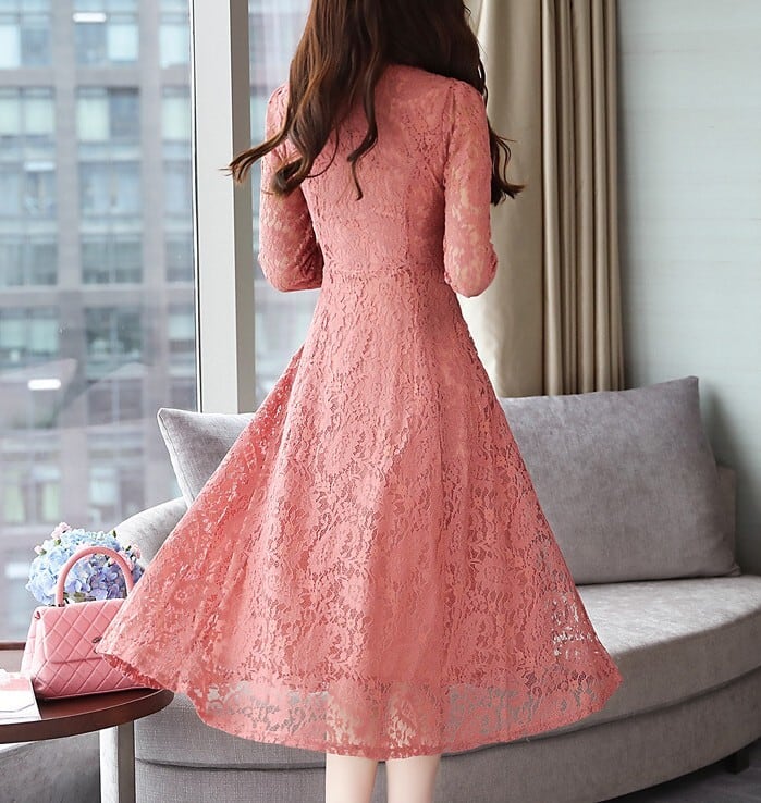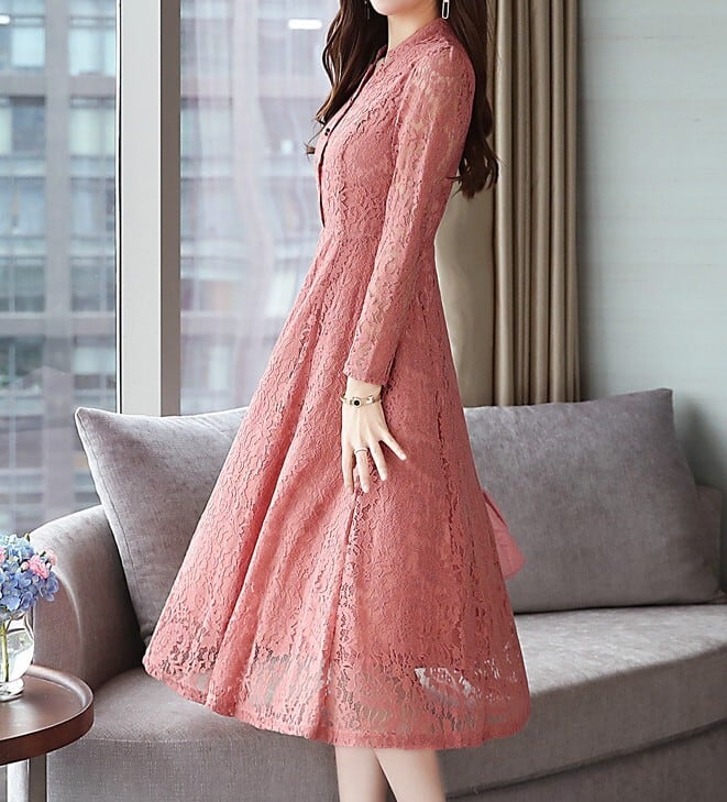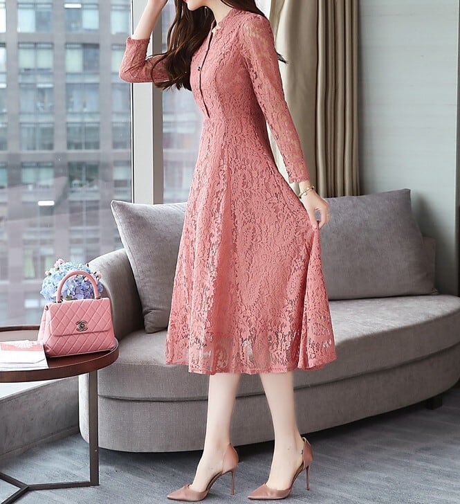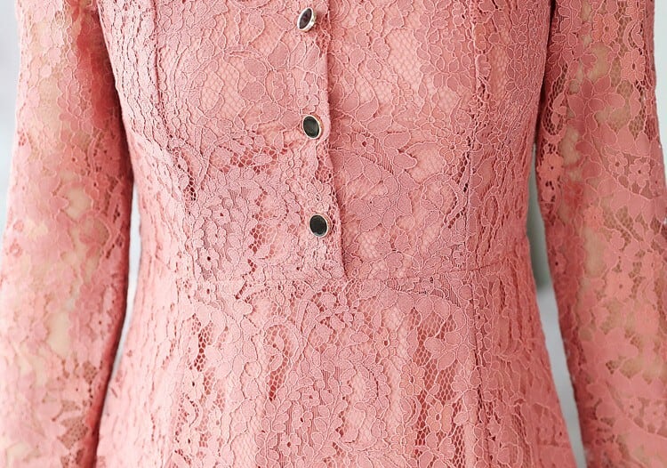 着用するだけでフェミニンな雰囲気が漂うスタンドカラーエレガントシングルブレストフレアロングレースドレス。