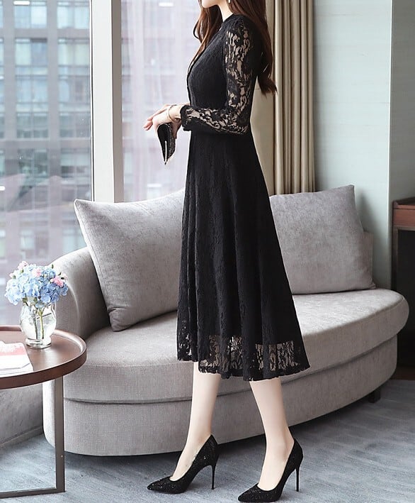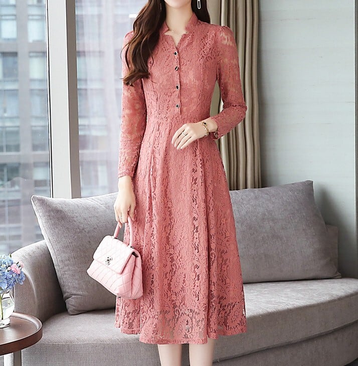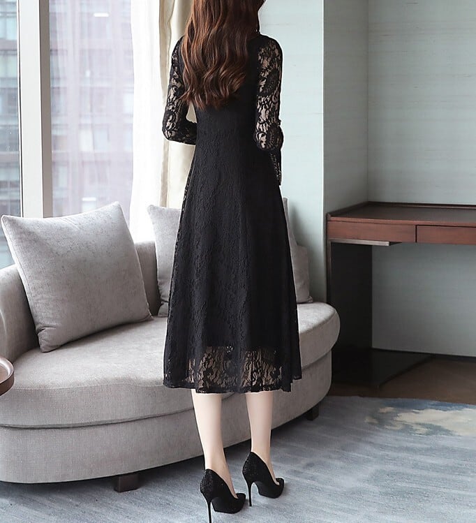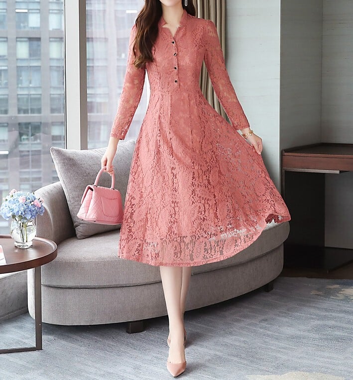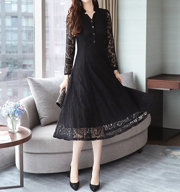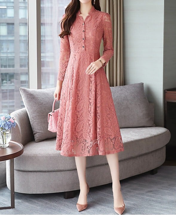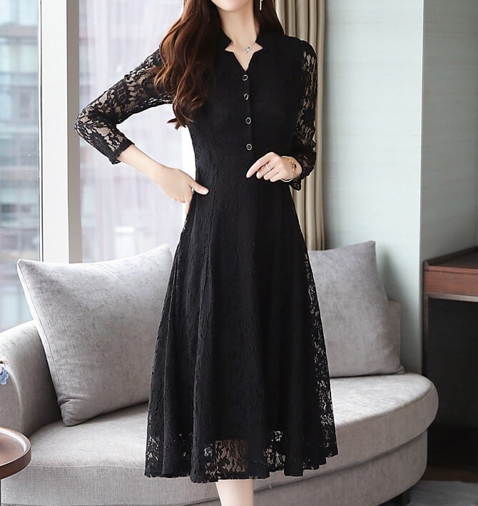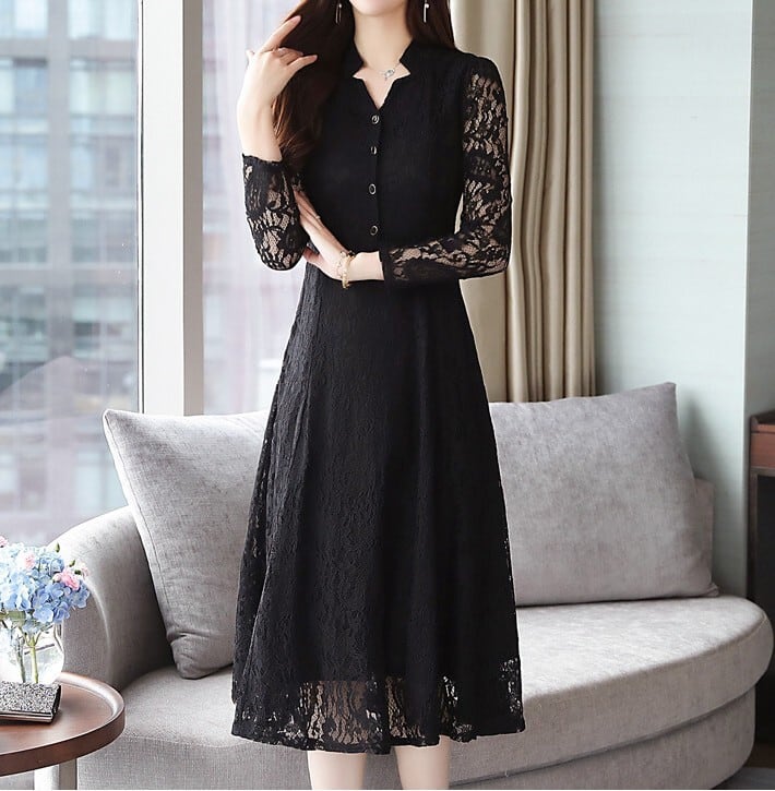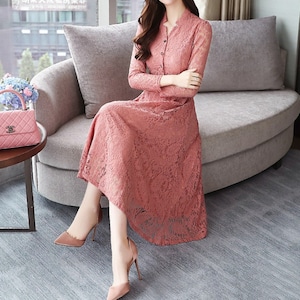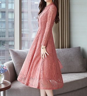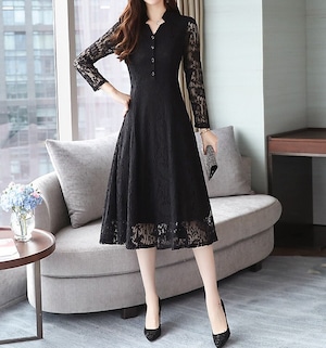 Stand collar elegant single breast flare long lace dress ( 2color )