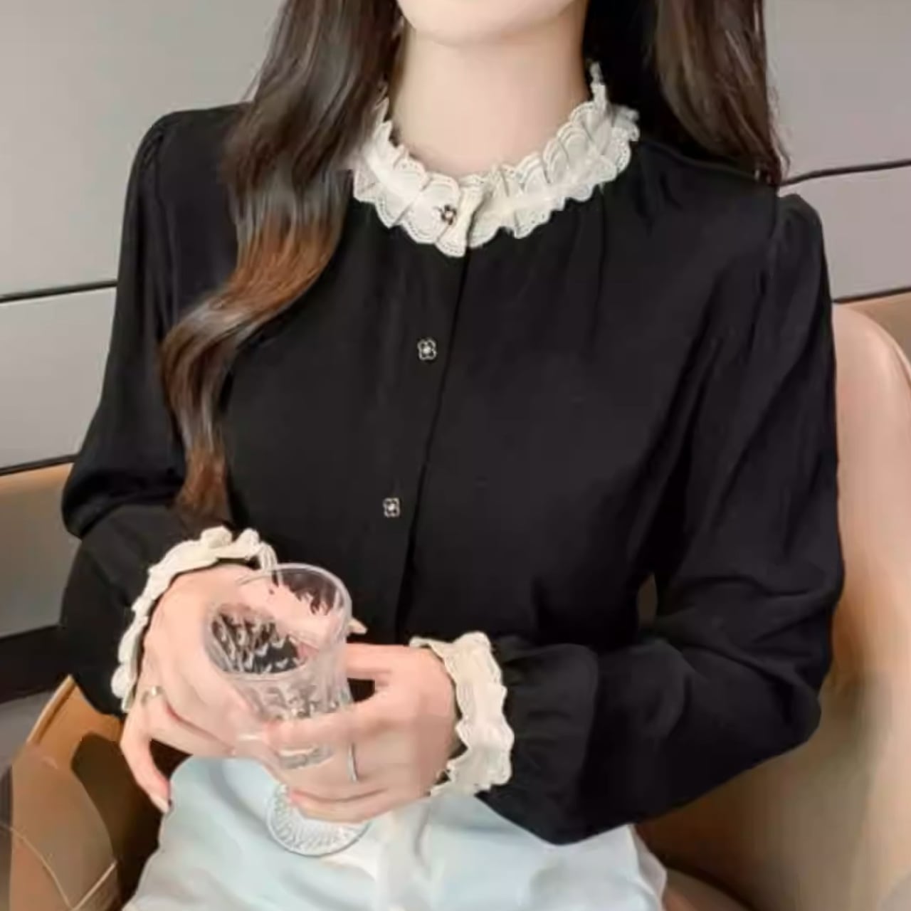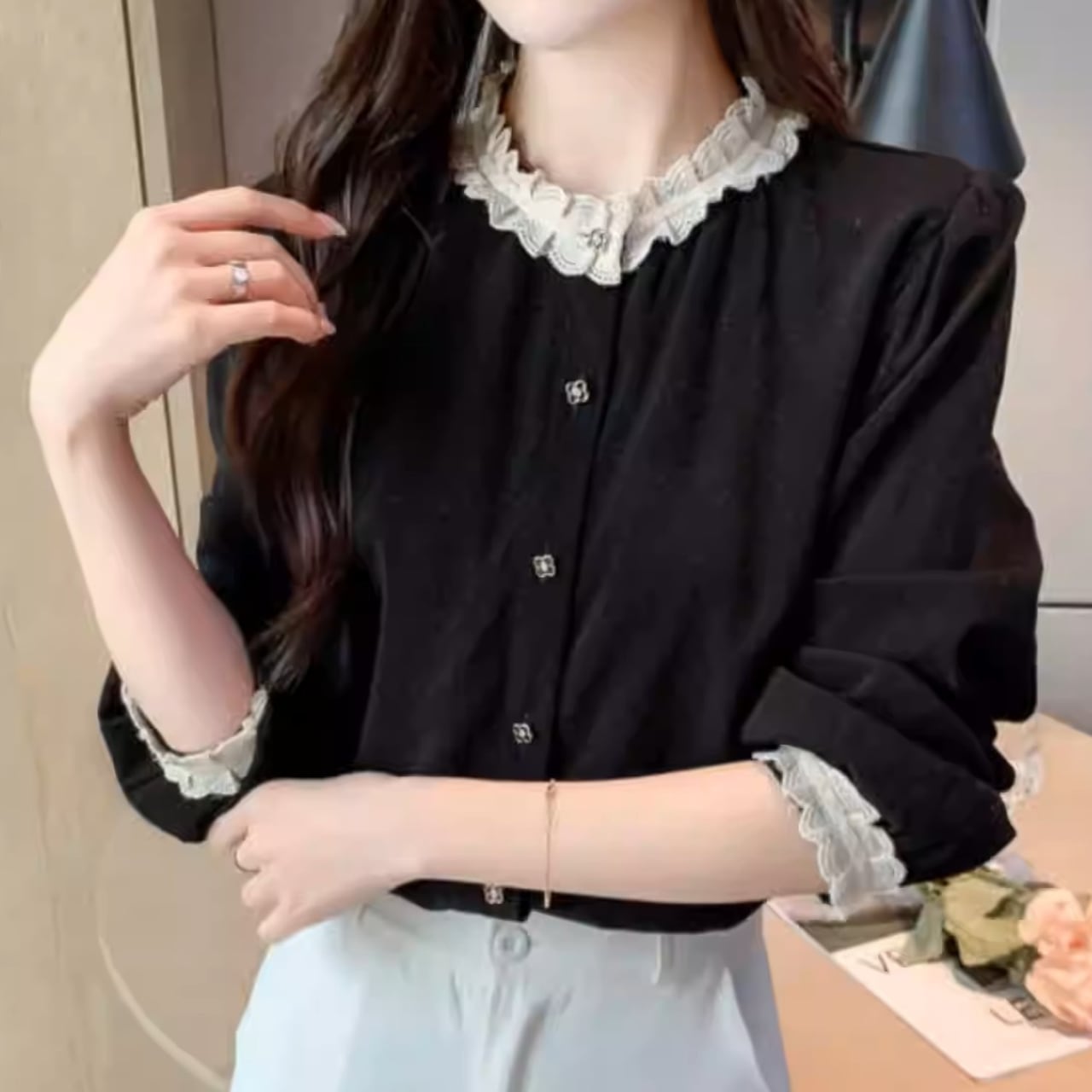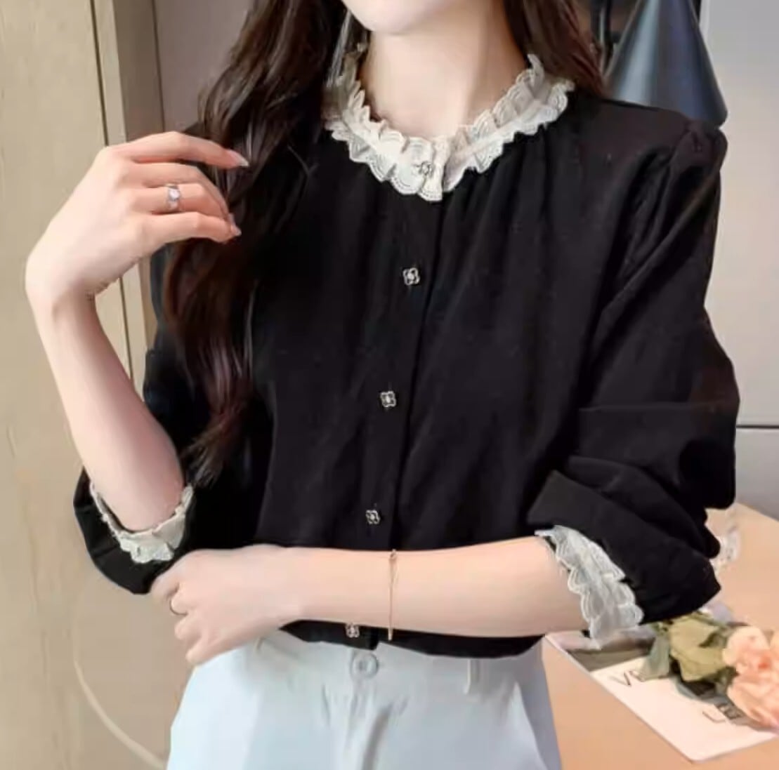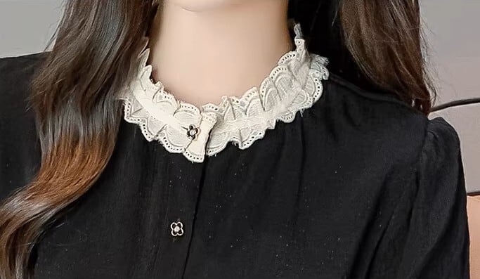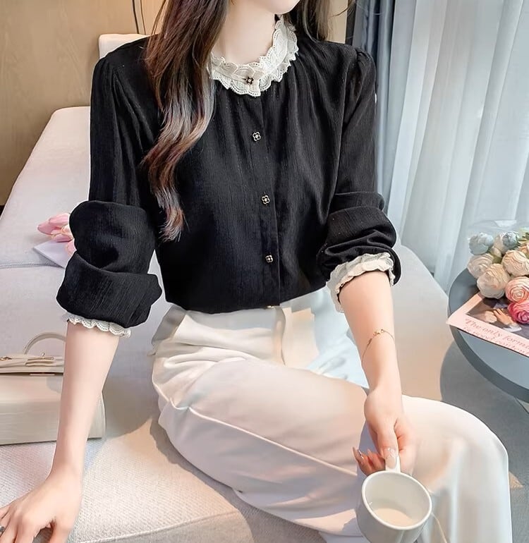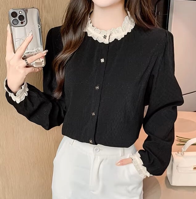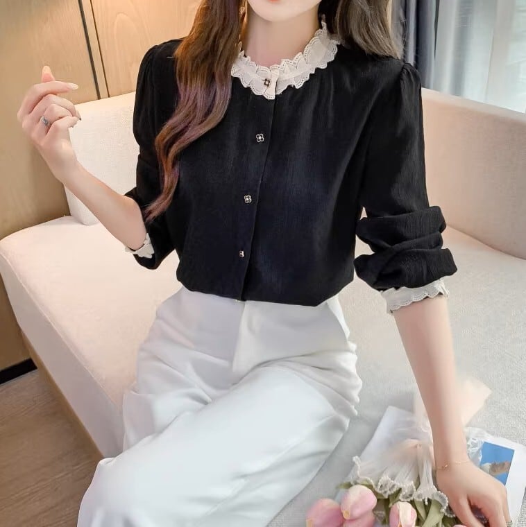 着用するだけで大人可愛い雰囲気が漂うスタンドカラーエレガントレースステッチレトロブラウス 。