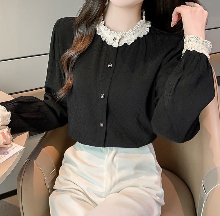 Stand collar elegant lace stitch retro blouse